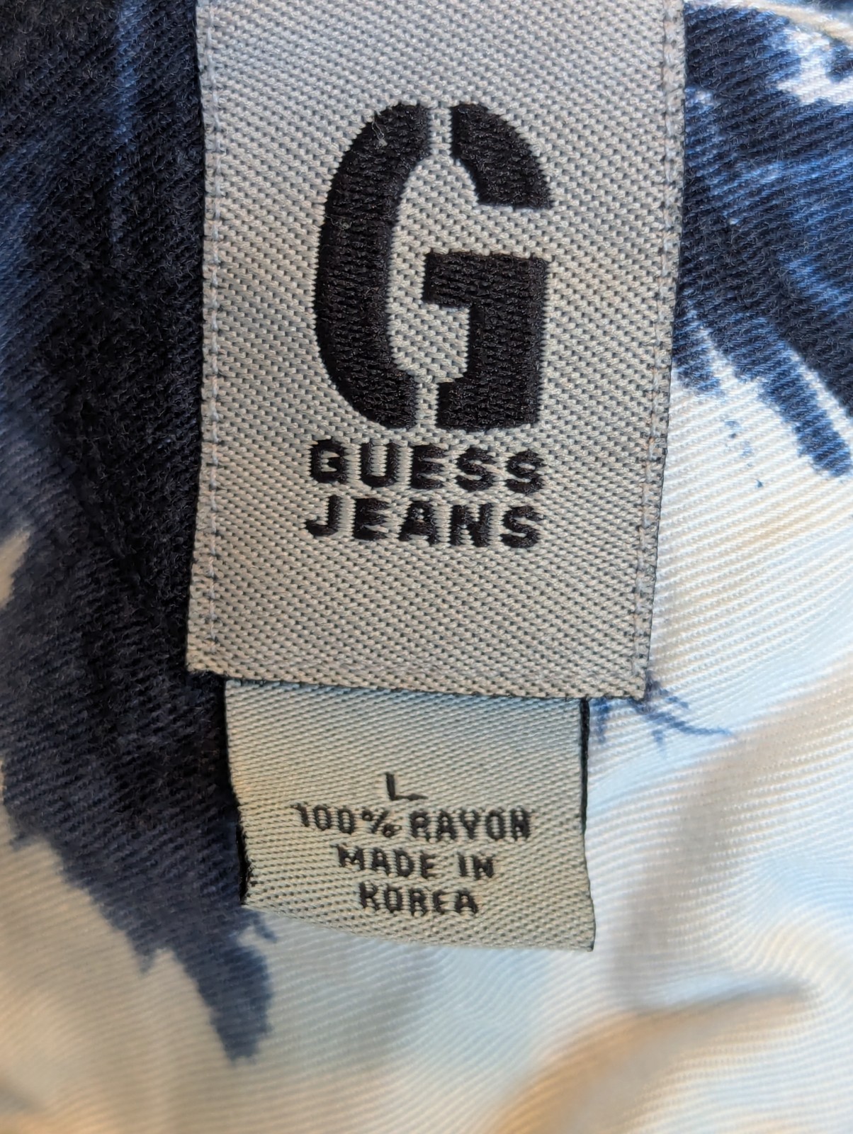 This is a true vintage gem from Guess American Tradition , made in Korea during the 80s. Featuring a bold tropical beach print with palm trees, huts, and sunset tones, this shirt captures that iconic retro Hawaiian/surf look that’s back in a big way. Crafted from soft, lightweight 100% rayon , it drapes perfectly and stays breathable, making it ideal for summer, vacations, or layering with a vintage streetwear fit. The oversized print and relaxed cut scream 80s style and the Made in Korea label confirms its authenticity as a rare piece from that golden era of Guess fashion. Brand: Guess Jeans / Guess American Tradition Style: M0241217 Cut: II636 Color Code: SRF Size: Men’s Large Material: 100% Rayon Country of Manufacture: Made in Korea Era: Vintage 80s. The tag does not even say "South" Korea Features: Bold beach scene graphic, palm trees, huts, classic button front, short sleeves Condition: Vintage gently used; fabric has natural wear consistent with age but no major flaws. These vintage Guess rayon shirts are getting harder to find , especially in larger sizes. Perfect for collectors, retro surf enthusiasts, or anyone who loves a one-of-a-kind throwback statement piece. I will always try and give accurate representation, although we are all human. One person's 'fair' could be another person's 'good'. As this is a used item, please look carefully at the photos to determine your opinion of its condition, or feel free and ask me questions about it. Thank you. PLEASE NOTE: I did my best to determine what era this shirt was from. I honestly believe it is from the mid to late 80s. I could be wrong, but I tried to determine the correct era. Wow, look at those old fashioned Guess tags. Item Specifics: Brand: Guess Jeans / Guess American Tradition Size: L (Men’s) Type: Hawaiian / Camp Shirt Material: 100% Rayon Color: Multicolor (blue, yellow, black, white) Era: Vintage 1980s Closure: Button front Features: Tropical beach scene, palm tree print, lightweight breathable fabric Condition: Vintage, gently used Made in: Korea Style Code: M0241217 Cut: II636 I will always try and give accurate representation, although we are all human. One person's "fair" could be another person's "good". As this is a used item, please look carefully at the photos to determine your opinion of its condition, or feel free and ask me questions about it. Thank you. 🎁 Gift Wrapping Available. Make your gift extra special for just five dollars. This item can be wrapped with care and include a personalized, hand-written note or label. If you're interested, purchase the item and send me a message before paying, I’ll send you an updated invoice with the $5 added. Let me know what you’d like your hand-written note or label to say. (no extra charge) You can choose from classic brown paper with string, feminine or masculine styles, kid-friendly themes, or many other ideas, we’ll do our best to match your preference. Your gift will be prepared with care so it’s ready to delight the recipient. ⋱⋰⋱⋰⋱⋰❀⋱⋰⋱⋰⋱⋰❀⋱⋰⋱⋰⋱⋰❀⋱⋰⋱⋰⋱⋰🦋 Thank you for visiting my auction today! Hello everyone, thank you for considering the Sunshine Smile Shop! I am a real person who loves to share nice things. I am committed to building a great reputation through excellent service and happy customers. When I say "we", "us" or "our" it's because my grandson and granddaughter are helping me out. One of us is always here to answer your questions. All items come from a pet-free, smoke-free home. I look forward to doing business with you, and I hope you’ll be delighted with your purchase. You may wish to follow us on eBay, as we often have really great deals in many different categories: www.ebay.com/usr/sunshinesmileshop ༻༺❀༻༺❀༻❀༺❀༻༺❀༻༺❀༻༺❀༻༺🐝
