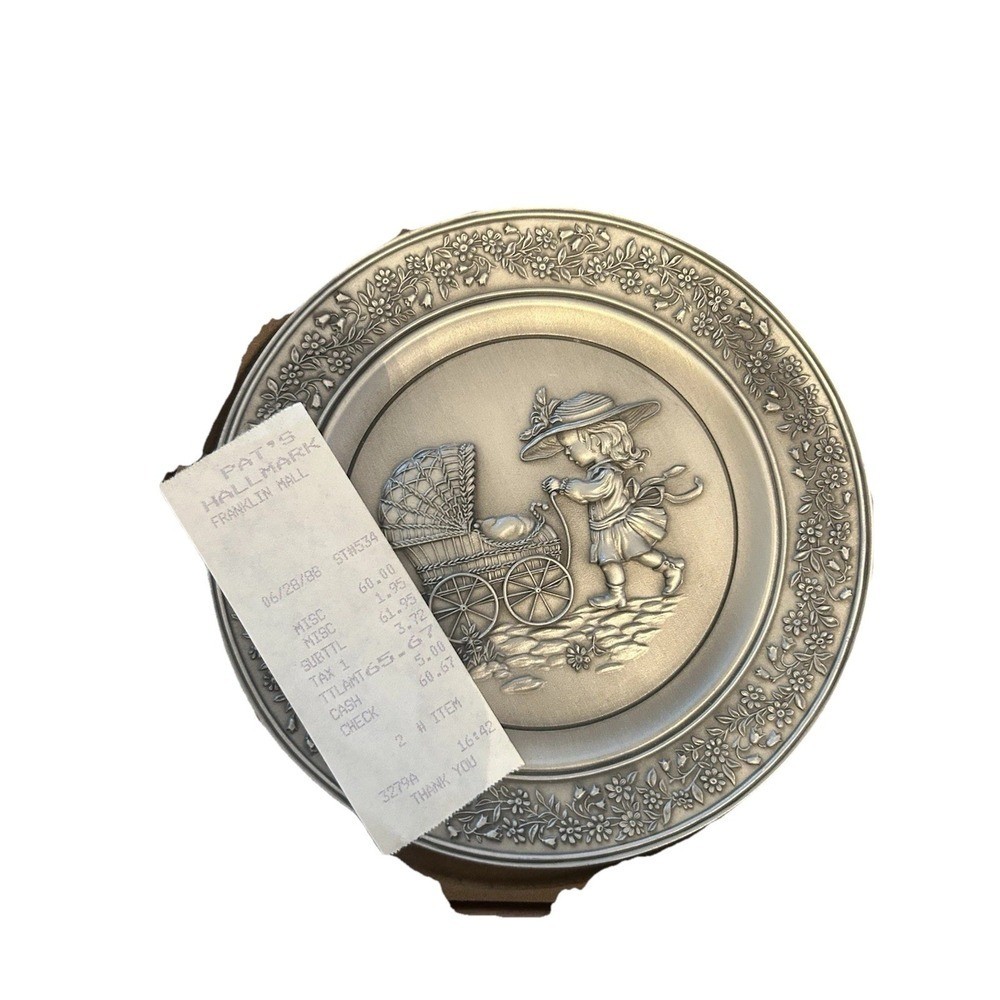 Capture a cherished moment with this exquisite 1980 Hallmark Little Gallery pewter plate. The detailed bas-relief depicts a sweet young girl pushing a vintage stroller, a heartwarming scene that evokes the tender bonds of home. Intricate floral borders gracefully frame the central image, adding a touch of timeless elegance. This collectible plate, designed by Tracy McKay and engraved by Bob Jones, is a beautiful reminder of special days and enduring love, perfect for display during holidays or as a precious keepsake for a nursery. Measurements: • Diameter: 6 in Time Period Manufactured: 1980-1989 Era: Late 20th Century (1970-1999) Culture: American Material: Metal Type: Collector Plate Item Diameter: 7.75 in Shape: Round Features: Engraved All items come from a smoke free, pet friendly home.We try