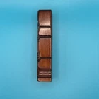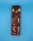 This hand-carved wooden figurine is a unique addition to any collection. The Tiki Island person figure features a totem pole design with intricate carvings and a wooden finish. Measuring 4.25 inches in height and 1.5 inches in width, this small figurine is perfect for any room and occasion. The figure depicts a person kneeling, thumbs up, sticking tongue out with brown wood tone. The carvings on the figurine are detailed and include a tongue and opal shell eyes. This original piece from the late 20th century is a must-have for collectors of Tiki and island-themed items. Carved in Rotorua, New Zealand