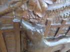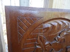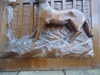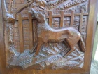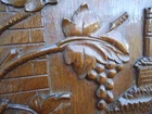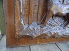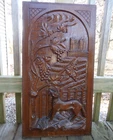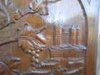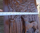 VTG Hand Carved Wood Relief Wolf Fox Castle Grapes Wall Panel Hardwood Art Measures approximately 27 3/16 tall x 14 11/16 Weighs 4.7 lbs. There are some small scuffs here and there and a bit of finish peeling on the edges (one larger spot of peeling finish in the upper right corner is shown up close). There is some markings on the top raw edge. There is a visible line around the edge of the panel where the it had been in a frame. All of this is show in the pictures, please see all.
