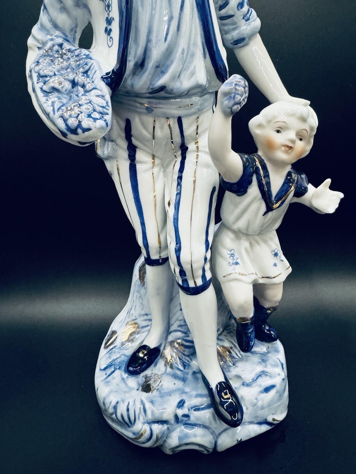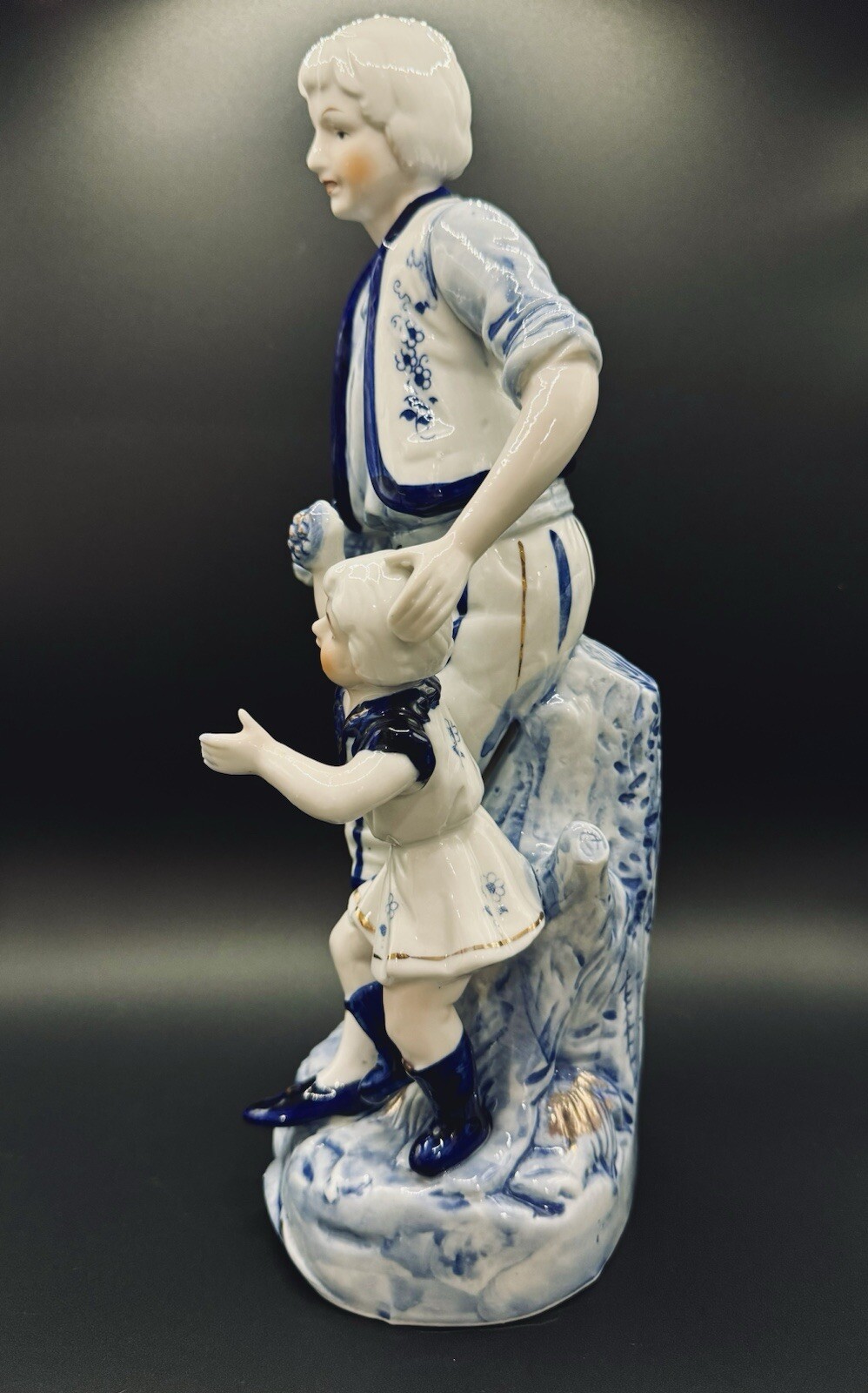 This vintage porcelain figurine depicts a father holding his child in a tender embrace. The intricate details and delicate hues of blue, white, and gold make this piece a beautiful addition to any collection. Measuring 12 inches in width, this figurine is crafted from high-quality porcelain and features a hand-painted finish. The brand is White and the type is a figurine, making it a perfect choice for collectors of decorative items. Whether you're a fan of sculptures or figurines, this piece is sure to impress.