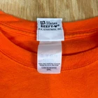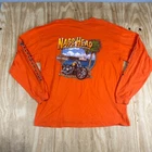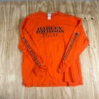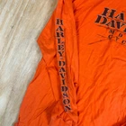 This is a vintage Hanes Beefy double-sided sweatshirt in orange with a Harley-Davidson graphic print. It has a crew neck and long sleeves, and is made of cotton knit fabric that is preshrunk, lightweight, breathable, and suitable for all seasons. The sweatshirt features a limited edition logo accent and is machine washable. It is a size 2XL and fits regular. The theme of the sweatshirt is motorcycles and the 80s and 90s.