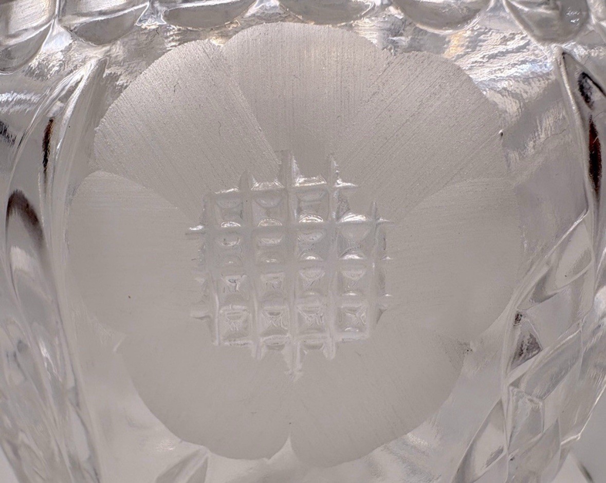 This vintage footed candy dish features a stunning lid with a pointed finial, reminiscent of Grandma’s treasured treat dish! The stunning crystal piece with intricate floral, diamond patterns, and rosette details will bring you right back to Granny’s sitting room and the excitement of what candy she might have inside. In very good vintage condition with no cracks- however, on the finial’s faceted top, there are some mild scuffs (shown in pictures) which do not impair function of the piece or compromise its structural integrity. With lid on, the dish measures approximately 9.75” in height and 6.25” in diameter at the widest point. Offers are always welcomed and appreciated! Thanks for stopping by 🤗
