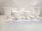 Indiana Colony Harvest Milk Glass 5 Water Goblets/1Sugar/1Creamer set features a charming Harvest Grape pattern, perfect for all occasions. Made of white milk glass with a round shape and decorative grapes, this vintage set is from the 1960s. The 7-piece set includes water goblets, sugar bowl, and creamer. Ideal for collectors or those looking to add a touch of vintage elegance to their drinkware collection.