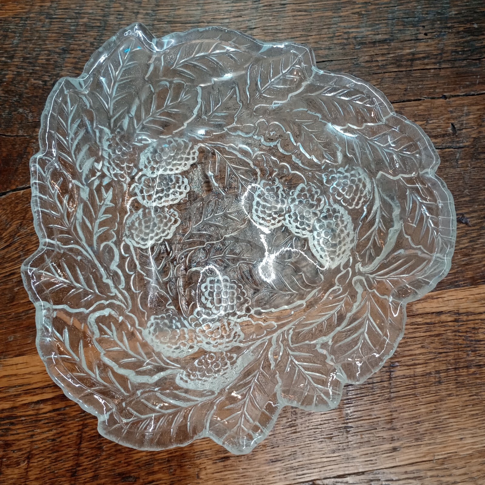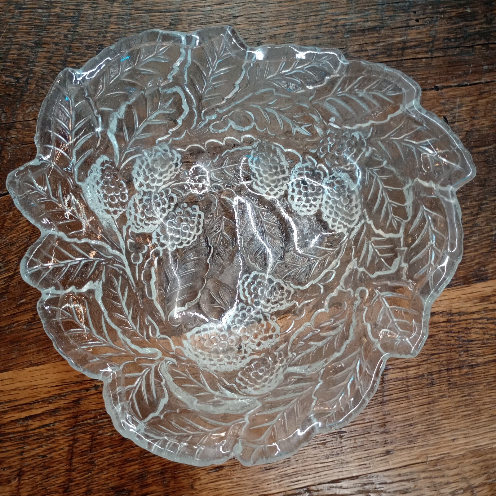This VTG Indiana Glass Loganberry Berries & Leaves Clear Triangular Bowl is a vintage piece of pressed glass from America. With a Mid-Century Modern style, this bowl features a glossy finish and decorative berries and leaves pattern. It is a single piece in the set, measuring 7.25" in length and height, and 2" in depth. Made by Indiana Glass in the 1960s, this microwave and dishwasher safe bowl is a unique addition to any collection.