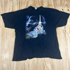 This is a rare, vintage T-shirt from the 90s featuring a parody graphic print between Family Guy and Star Wars. The shirt is made of heavyweight cotton and has a round neck and short sleeves. It is black in color and features the logo accents. The shirt is machine washable and easy to care for, making it a great addition to any wardrobe. The T-shirt is a limited edition, lightweight, and versatile piece that can be worn in all seasons, whether it's winter, summer, fall, or spring. It is a great gift for fans of Family Guy and Star Wars, as well as those who appreciate funny and unique graphic prints. The shirt is available in size XL and is suitable for regular fit.