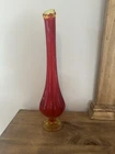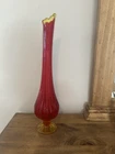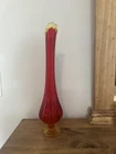 Elevate your home decor with the striking VTG MCM LE Smith 15.5” Amberina Swung Stretch Ribbed Glass Vase. A true representation of Mid-Century Modern style, this vase boasts an eye-catching amberina color that ranges from warm red to vibrant orange, capturing the essence of a bygone era. Crafted from hand-blown glass, its textured, high-gloss surface and ribbed pattern add a touch of abstract art to any room. This decorative piece, originating from the United States in 1953, is a testament to the skillful production techniques of the time. It stands as an original, unmodified treasure from the 1960-1969 period, complete with the artistic nuances that enthusiasts of MCM appreciate. Whether displayed alone or as part of a curated collection, this vase is sure to be a conversation starter. No chips or cracks. Has a black mark inside the glass as shown