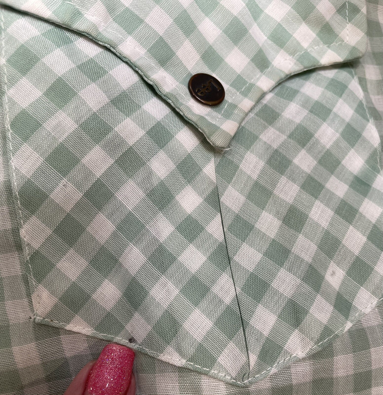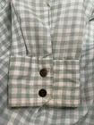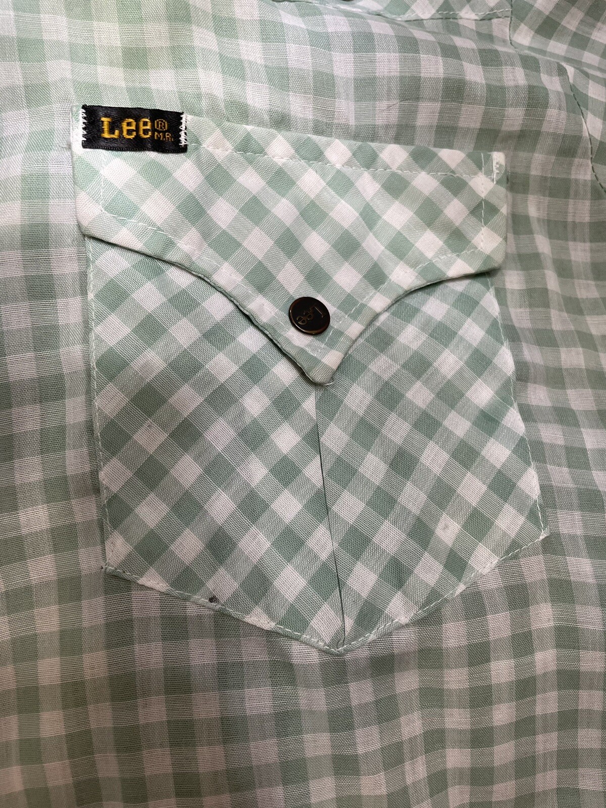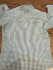 The MR Lee Shirt is a vintage men's snap-up shirt in size L, featuring a green and white gingham pattern with long sleeves and snap closures. Made from a mix of polyester and cotton, this shirt is perfect for casual occasions, workwear, or even business events. Its hipster, western, cowboy, and rockabilly themes make it a unique and stylish addition to any wardrobe. The shirt is part of the MR Lee product line and is designed for year-round wear in all seasons. Armpit to armpit: 22” Length from top of collar to hem: 33” Sleeve length from shoulder seam to cuff: 24” One small hole in front left pocket (see photo) Thin fabric - darts in back From a smoke free home