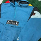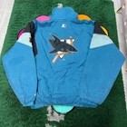 Vintage 90s NHL Hockey San Jose Sharks All Embroidered Front & Back Logo Heavy Weight Blue Puffer Starter Jacket 1990s Dated Size X-Large (side zipper doesn’t work but doesn’t affect the jacket) P2P 29 Length 29.5 #vintage #sharks #sanjosw #hockey #puffer