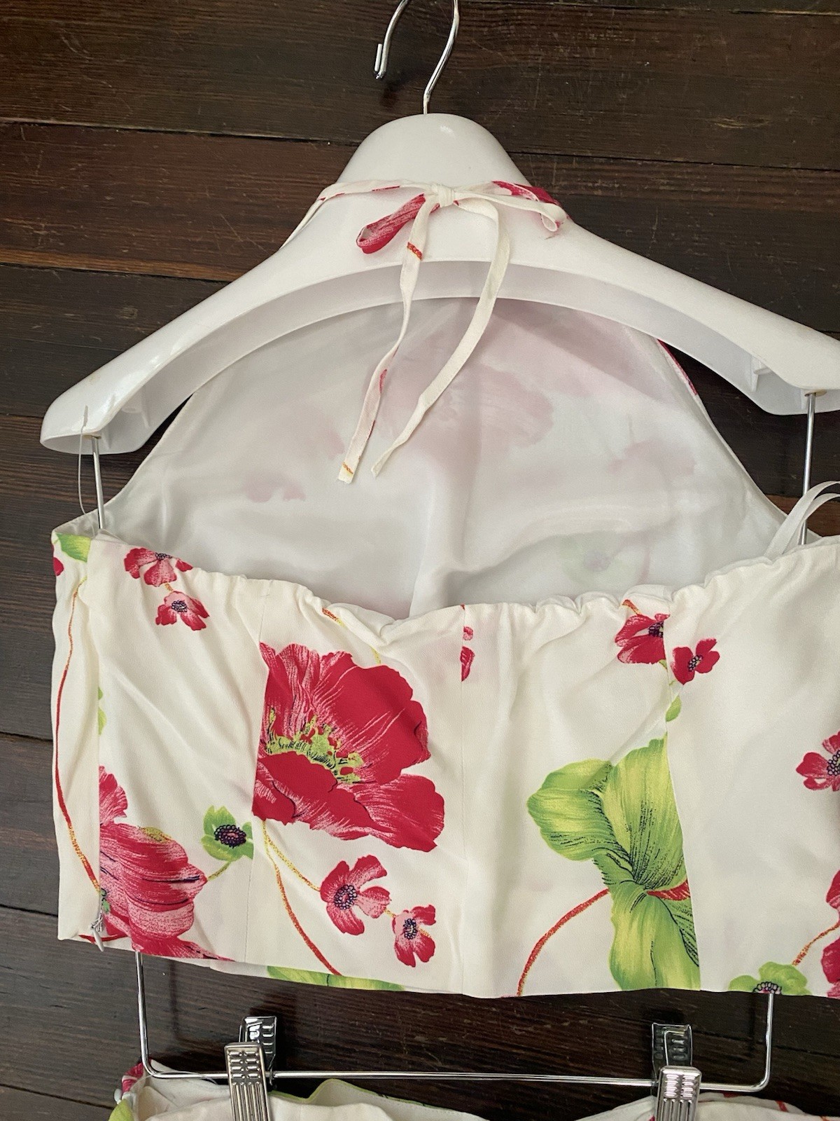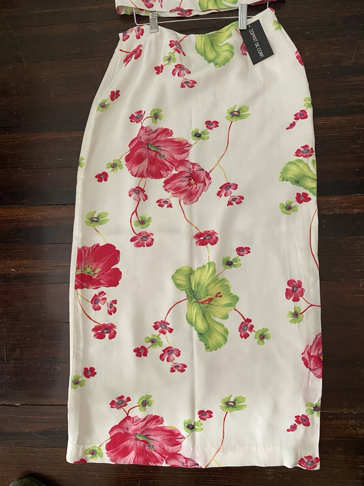 Step into a world of timeless elegance with this vintage NWT Esprit a-line maxi skirt and tie halter top set, a chic addition to any wardrobe. The ensemble features a delightful white background adorned with a vibrant pink and green floral pattern, perfect for a fresh and feminine look. Designed for the style-conscious woman, the size 9/10 pieces offer a flattering fit Crafted from soft and breathable rayon, this set promises comfort and style through the day or evening. Both pieces are fully lined and skirt has an invisible zipper closure. The long skirt with side slit and matching halter top create a cohesive and classy outfit, ideal for a variety of occasions. Whether it's a garden party or a casual day out, this vintage duo is a must-have for those who appreciate classic beauty in fashion. See our Nippon Boutique jacket in hot pink/ watermelon as a possible companion piece to this two piece set. 36 inch skirt length. Pet and smoke free environment.