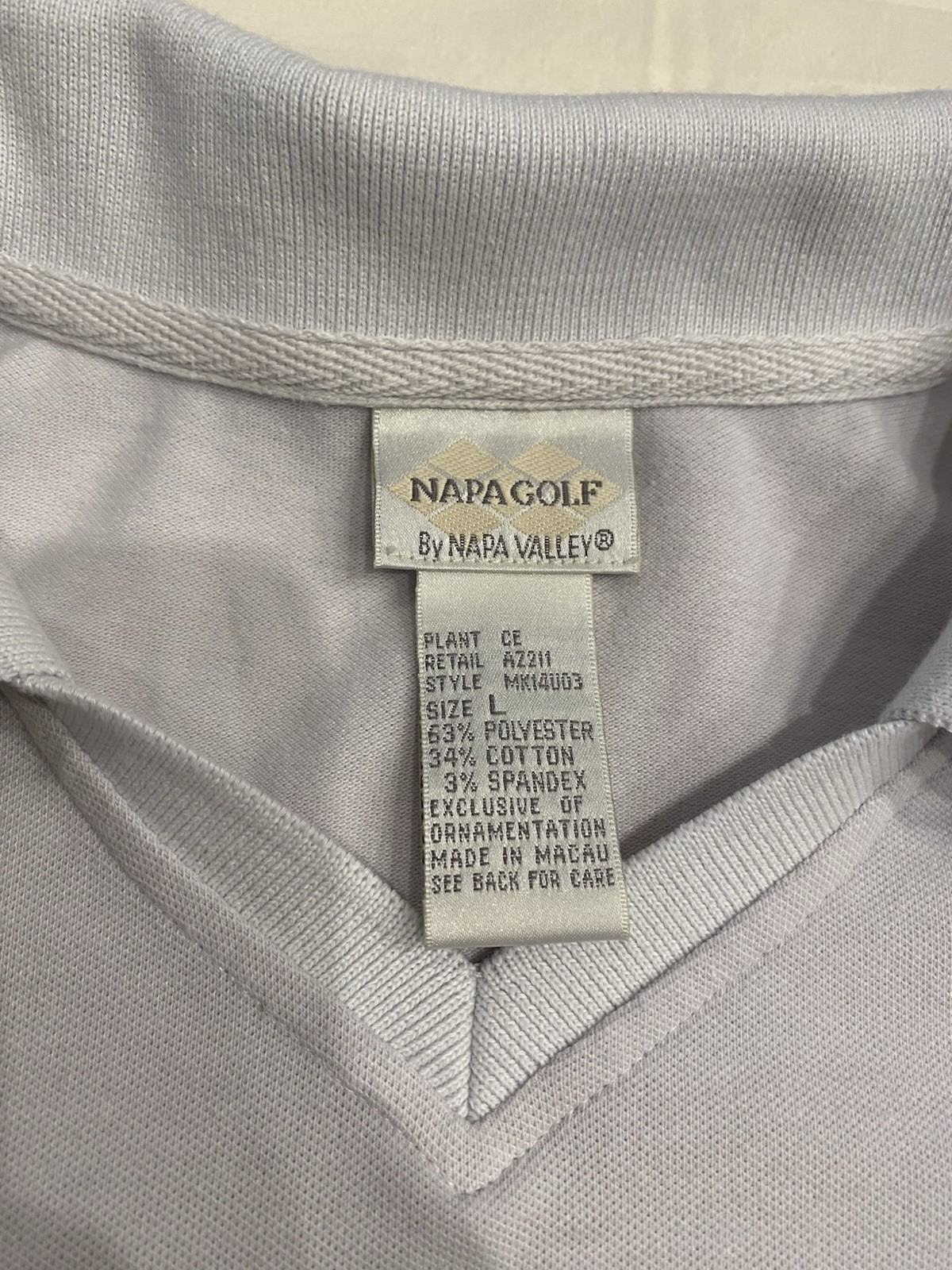 The VTG Napa Valley V-neck Pullover Shirt is a stylish and comfortable women’s top in size L. Made from a blend of polyester, spandex, and cotton, this shirt features a classic solid grayish/light blue color with embroidered Napa Valley logos of golfers. The pullover style, collared neckline, and short sleeves make it perfect for casual occasions, while the retro theme adds a touch of nostalgia. Machine washable and suitable for all seasons, this vintage-inspired polo is a versatile wardrobe staple. This is preowned-great/excellent condition. Only “flaw” is that I believe this used to be a white polo but is now more of a light gray/bluish color likely due to the previous owner washing with blues. I think it just adds to the character of this vintage shirt ☺️!