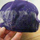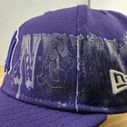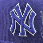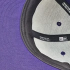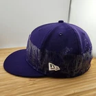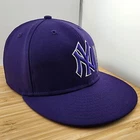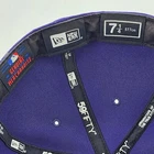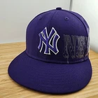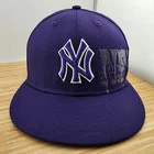 This is a vintage New York Yankees baseball cap made by New Era, officially licensed by Major League Baseball. The cap is crafted from 100% wool in a size 7 1/4 and features a vibrant purple color. It includes a unique side print design and is designed for men. The cap is a stylish and high-quality piece of fan apparel, perfect for any supporter of the New York Yankees or baseball enthusiasts.