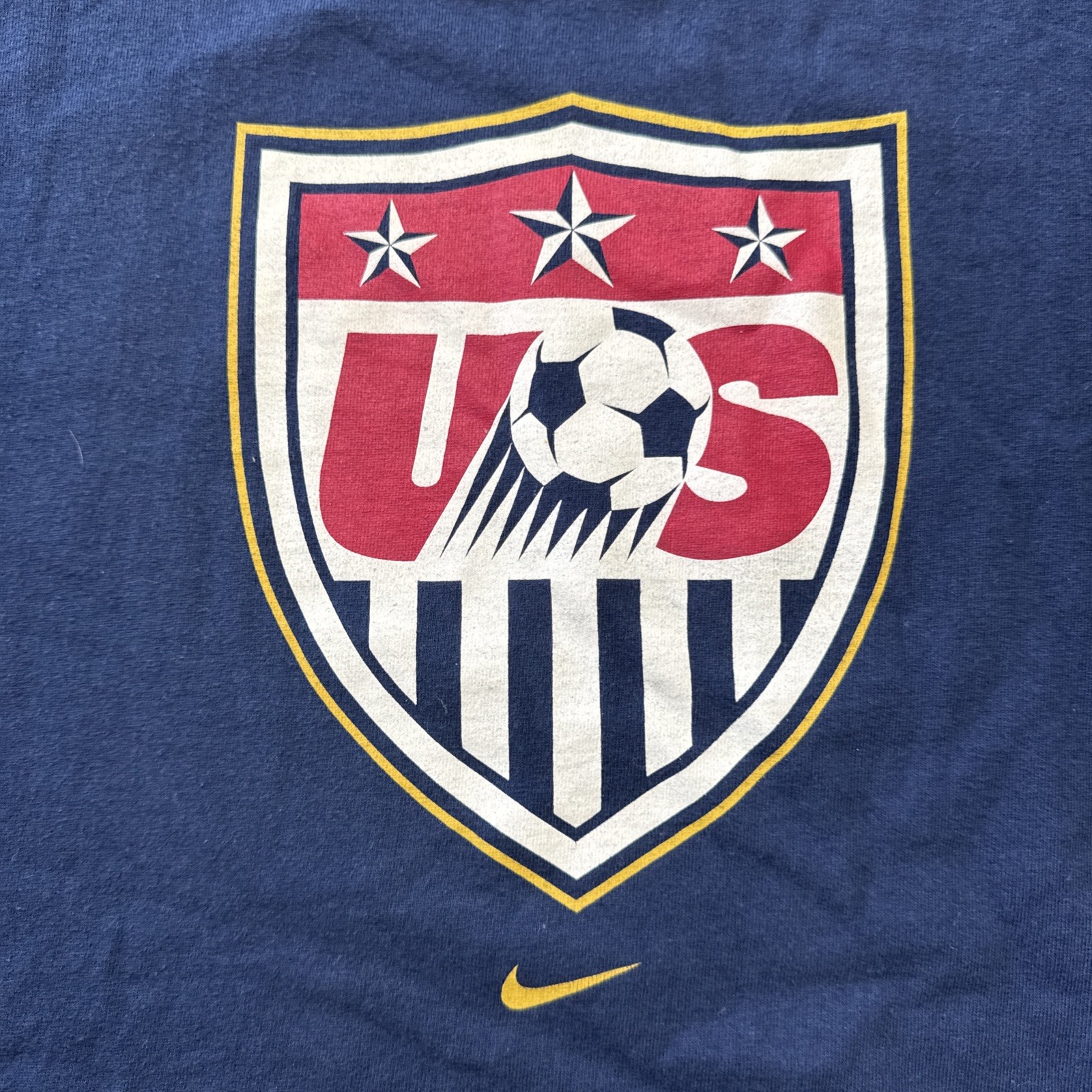 The VTG Nike Soccer Shirt in Adult XL Navy is a vintage-inspired T-shirt perfect for any fan of US Soccer or Team USA. Made of cotton with a crew neck and short sleeves, this shirt features the Nike logo and a solid blue color. It is machine washable and designed for regular fit, making it a comfortable and stylish choice for any season. Whether you're cheering on the USMNT or showing support for Team USA, this shirt is a great addition to any athletic wardrobe.