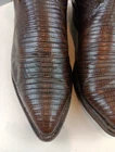 There are some signs of wear and tear. See photos for more details. These vintage Nocona cowboy boots are a must-have for any Western enthusiast. Crafted with brown lizard skin and a leather lining, these boots feature an almond toe shape and a mid-calf shaft style. The pull-on closure and leather outsole provide both comfort and durability, making them perfect for any cowboy task. The boots are handmade in the United States and showcase a unique lizard skin pattern. With a men's size 9D, these boots are perfect for any cowboy looking for a stylish and functional addition to their wardrobe. The insole is also made of leather, providing a comfortable fit for all-day wear. Get your hands on these beautiful Nocona boots and add a touch of Western style to your wardrobe today.