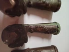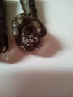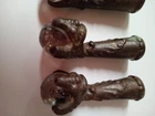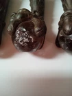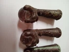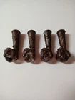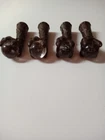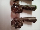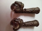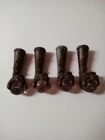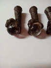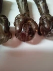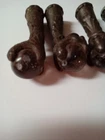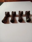 These vintage North Wind furniture legs feature a unique design with faces on top, crafted from cast iron in a round shape with claw feet and glass balls. The set includes four legs, each measuring 4 inches in length and originating from the Victorian era in the United States. These Victorian-style furniture legs are a distinctive addition to any room, combining both decorative and functional elements with their intricate detailing and sturdy construction. These legs are in used condition with scuffs, scratches and some green paint from previous use. There is a small crack on one of the legs. See photos. h See photos.
