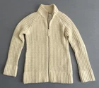 Vintage 2007 Old Navy women’s size Medium zip cardigan. 50% wool, 50% acrylic. Chunky open knit with large cuffs. Nice creamy ivory shade. Long and skinny arms and body length. Good condition, slight signs of wear/piling from age and wear. See pictures for measurements.