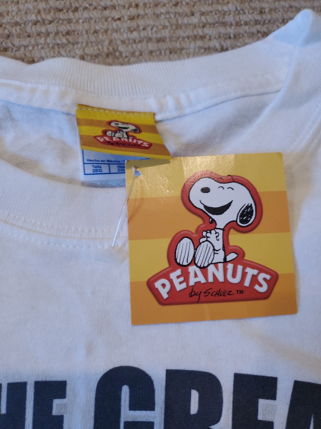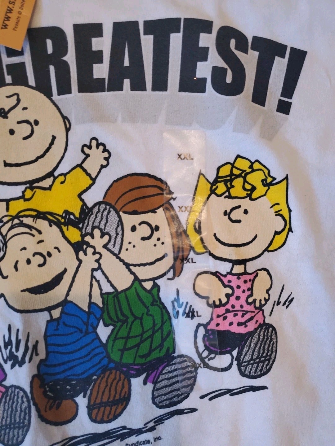Embrace your love for the iconic Peanuts franchise with this vintage white T-shirt, featuring the legendary Charles M. Schulz's beloved characters, Snoopy and Charlie Brown. With a graphic print that proclaims "You're The Greatest," this tee captures the essence of timeless cartoon nostalgia. Designed for comfort and style, it boasts a classic crew neck and a regular fit, making it a versatile addition to any wardrobe. Crafted from soft, breathable cotton, this men's size 2XL shirt ensures all-day ease and a relaxed feel. Despite its vintage charm, the piece remains in enduring popularity, thanks in part to its timeless design and the enduring appeal of the Peanuts character family. Made in Mexico, this T-shirt is a subtle nod to a bygone era of animation and comics. The shirt has some dirt, but has all tags attached to shirt as well as the XXL sticker across the front. Located in side room dresser.