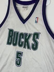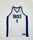 Vintage Reebok Authentic NBA Milwaukee Bucks Tim Thomas #5 Jersey Size 60 HUGE Sewn RARE Decent - to - pretty good condition overall - see ALL photos very closely - worn white jersey - only flaws little stains throughout - READ Massive huge jersey size - Size 60 - see tag Jersey is in pretty solid condition overall - has light - moderate wear/tear overall - however jersey has faint little stains/marks throughout both sides of the jersey - mostly on front side - some on back side too - stains are mid chest area to bottom trim throughout - little stains /marks small - mid size only flaws - see ALL photos very closely for condition of jersey Will ship with care