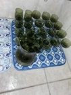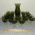 This is a vintage Sasaki hand blown glassware set in a Fantasia Smokey green color. The set includes cordial glasses with etched stems and a pitcher, totaling 21 pieces. The design of the glassware is intricate and stylish, perfect for serving drinks in a sophisticated manner. All pieces are hand crafted in the 1970s, made by sasaki in Japan. Here is what is included in the 21 piece set: 8-6 oz glasswares 11-4oz glasswares 1-8oz glasswares 1-48oz pitcher **Creamer bottle for size reference not included in listing. Drying mats not included in listing**