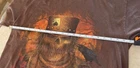 This is a vintage brown T-shirt with a Scarecrow Skull pattern, featuring a top hat, a crow, and poker cards. The shirt is made of 100% cotton knit fabric and has a classic fit with short sleeves and a crew neckline. It is a size Large and was manufactured between 2000-2009 in El Salvador. The shirt is a graphic tee with a Halloween theme and is perfect for casual occasions. This shirt is in good preowned condition, with only light signs of wear. Please see ALL photos for a better idea on condition, any measurements, or details to the shirt.
