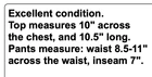 Excellent condition. Top measures 10" across the chest, and 10.5" long. Pants measure: waist 8.5-11" across the waist, inseam 7". THANK YOU EBAY!!! We are so thankful for our customers! We have thousands of listings, and therefore receive hundreds of messages, every single day. So, if you are asking about a price drop, or a shipping price drop, or asking for extra measurements, or to add additional photos, please allow me to answer you here, No thanks. If your question is not one of those questions, we will be /happy to answer you individually. YES...WE DO COMBINE DOMESTIC SHIPPING. Extra jewelry items ship for $2 each (except for large jewelry lots). We will refund the difference as we are mailing out.....we hope you enjoy shopping with us! We encourage you to read the description and check all photos.