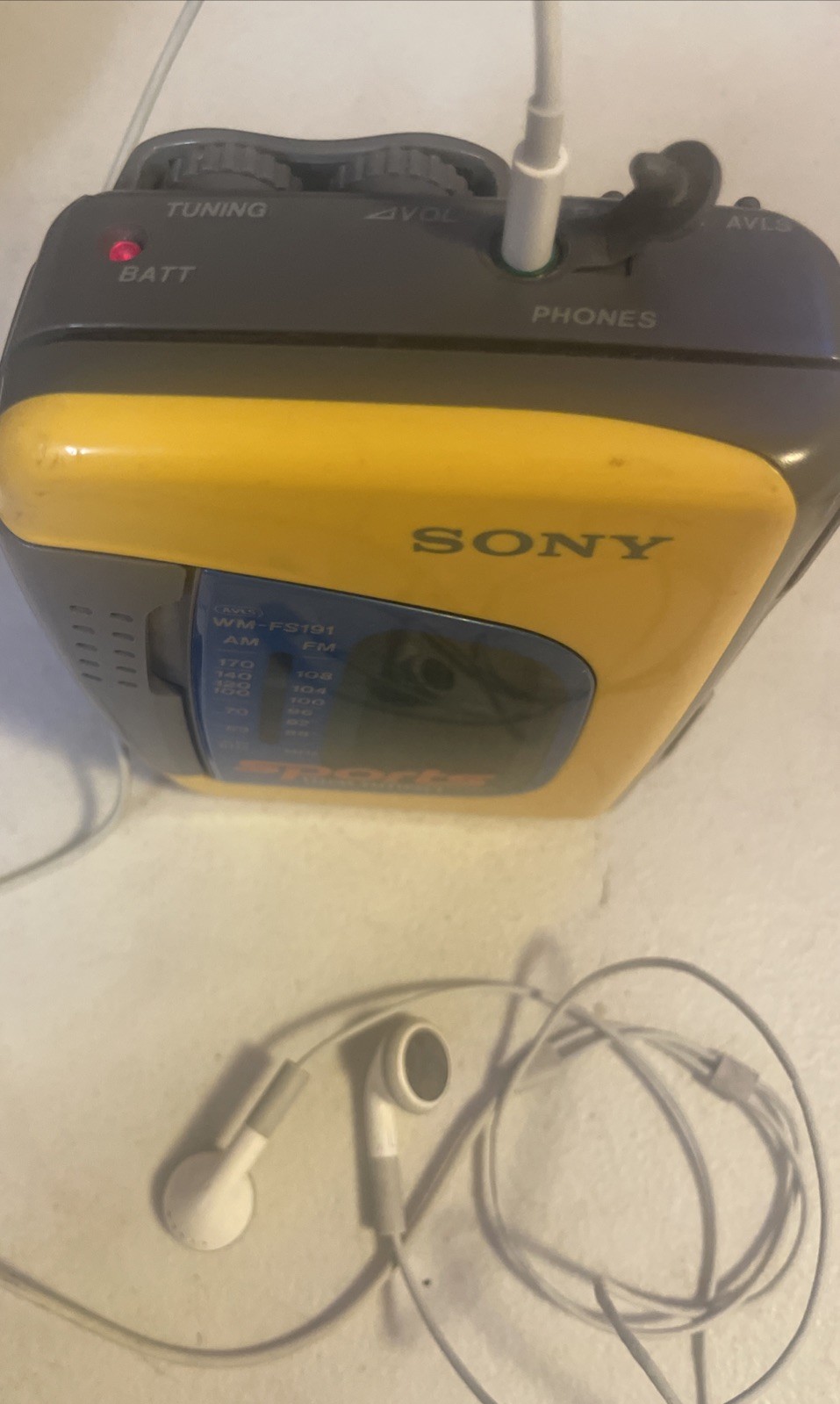The VTG Sony Sports Walkman WM-FS191 is a portable audio device that combines AM/FM radio capabilities with a cassette player. With its classic Walkman design and vibrant yellow color, this retro Sony device is perfect for listening to your favorite radio stations and cassette tapes on the go. The AM/FM radio feature allows you to tune in to your favorite frequencies, while the cassette player lets you enjoy your favorite music with high-quality sound. Whether you're a collector of vintage electronics or just looking for a reliable portable audio device, the VTG Sony Sports Walkman WM-FS191 is a standout choice. Working tested radio works and tape Player works comes with head phone sold as is in pictures