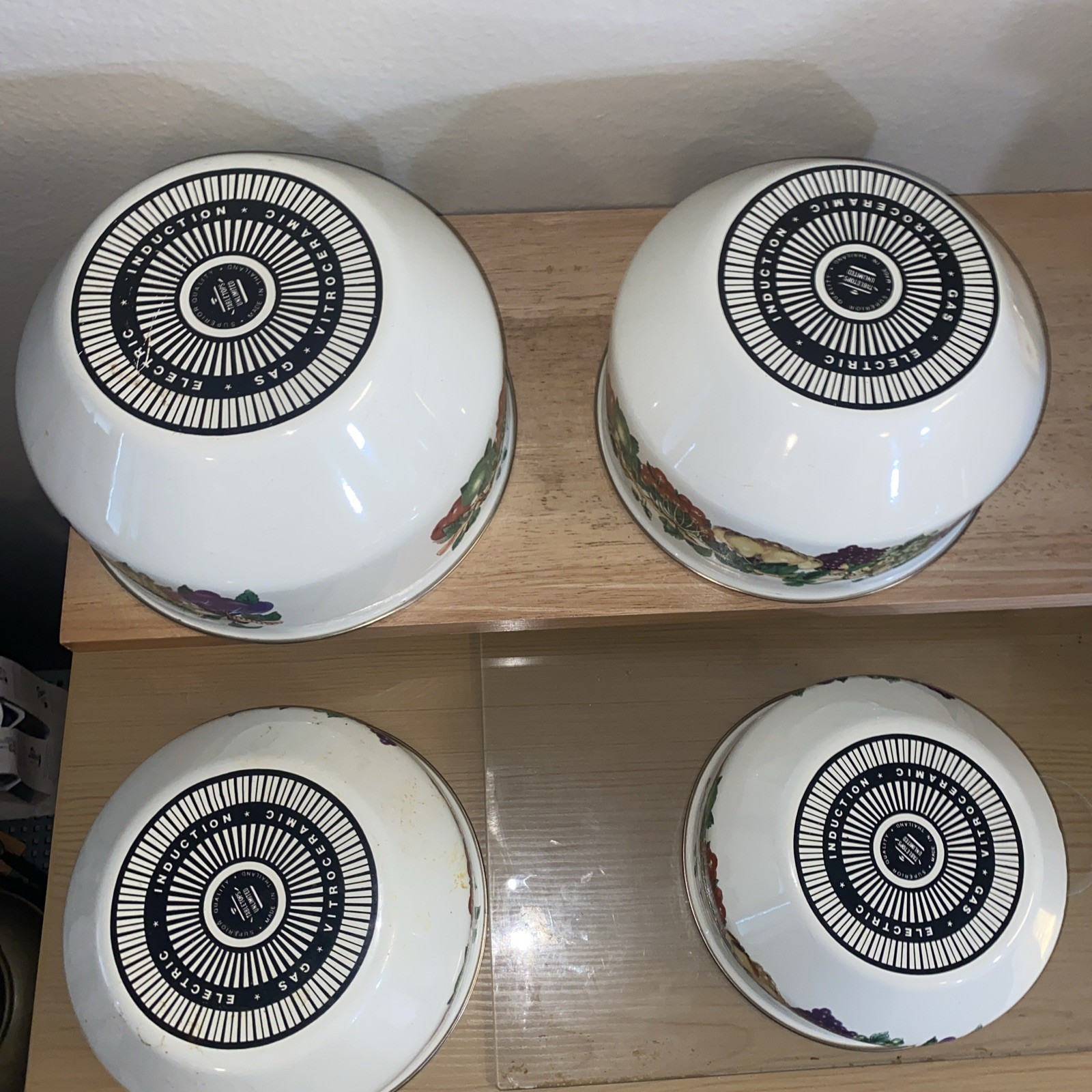 The VTG Tabletop Unlimited Vitroceramic Kensington Garden Bowls Set Of 4 is a vintage set of multicolor induction pans with a ceramic surface coating. These everyday induction pans are original and vary in capacity. Perfect for adding a touch of nostalgia to any kitchen, these bowls are designed for use on induction stoves and can add a whimsical touch to your cooking experience. Please look at photos - two of the bowls have silver rims the other two are goldish. Overall good condition see photos though for Minor imperfections