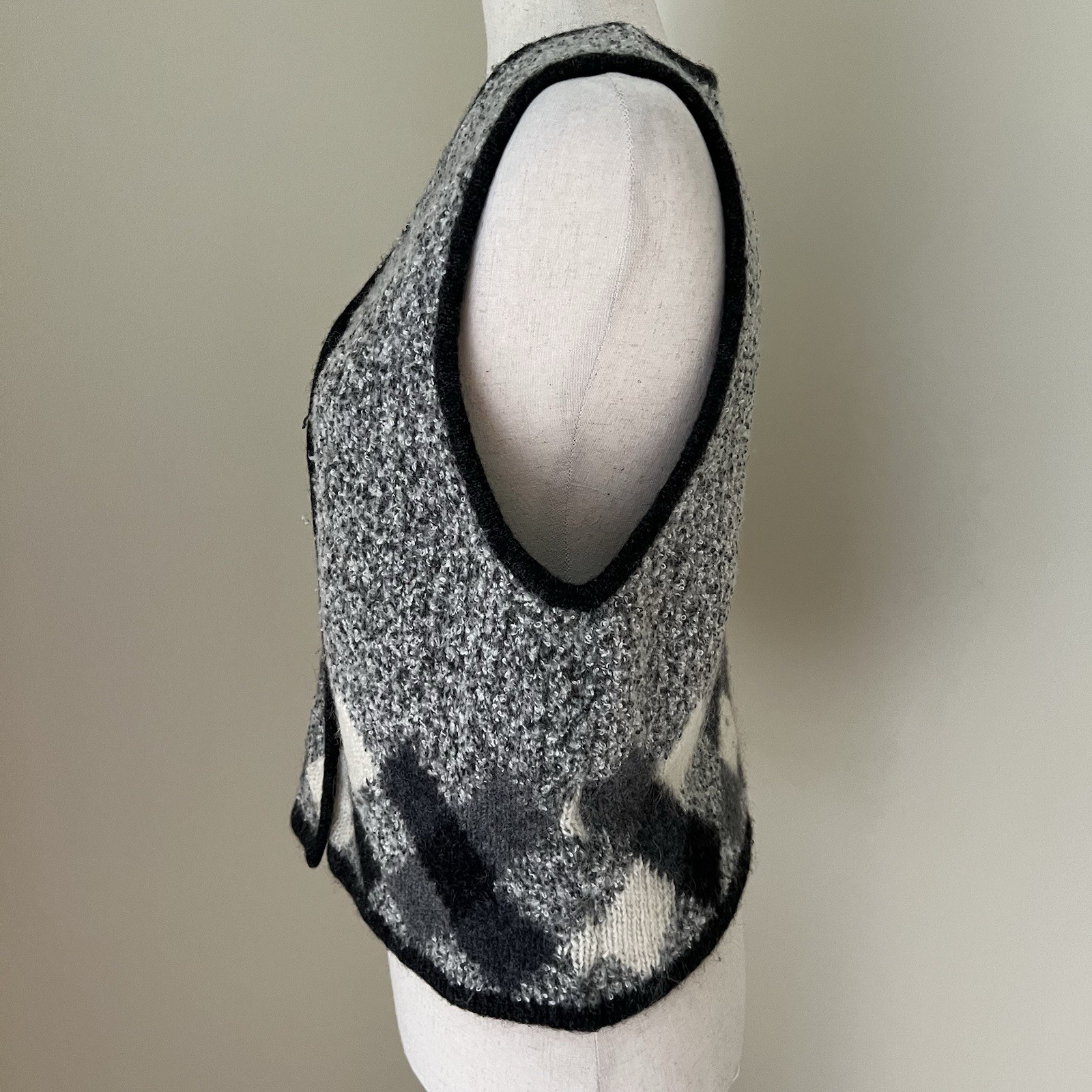 The VTG Talbots Women's Button Up Sweater Vest in size L is a classic and preppy piece perfect for various occasions such as travel, parties, casual wear, or business meetings. Made from a wool and acrylic knit fabric, this sleeveless vest features a V-neckline and button accents, adding a timeless touch to your outfit. The black and white color scheme and argyle/diamond pattern give off a sophisticated and vintage old money vibe, making it a versatile addition to your wardrobe. Perfect for those who appreciate a blend of school or university themes with a touch of geeky or 90s style.
