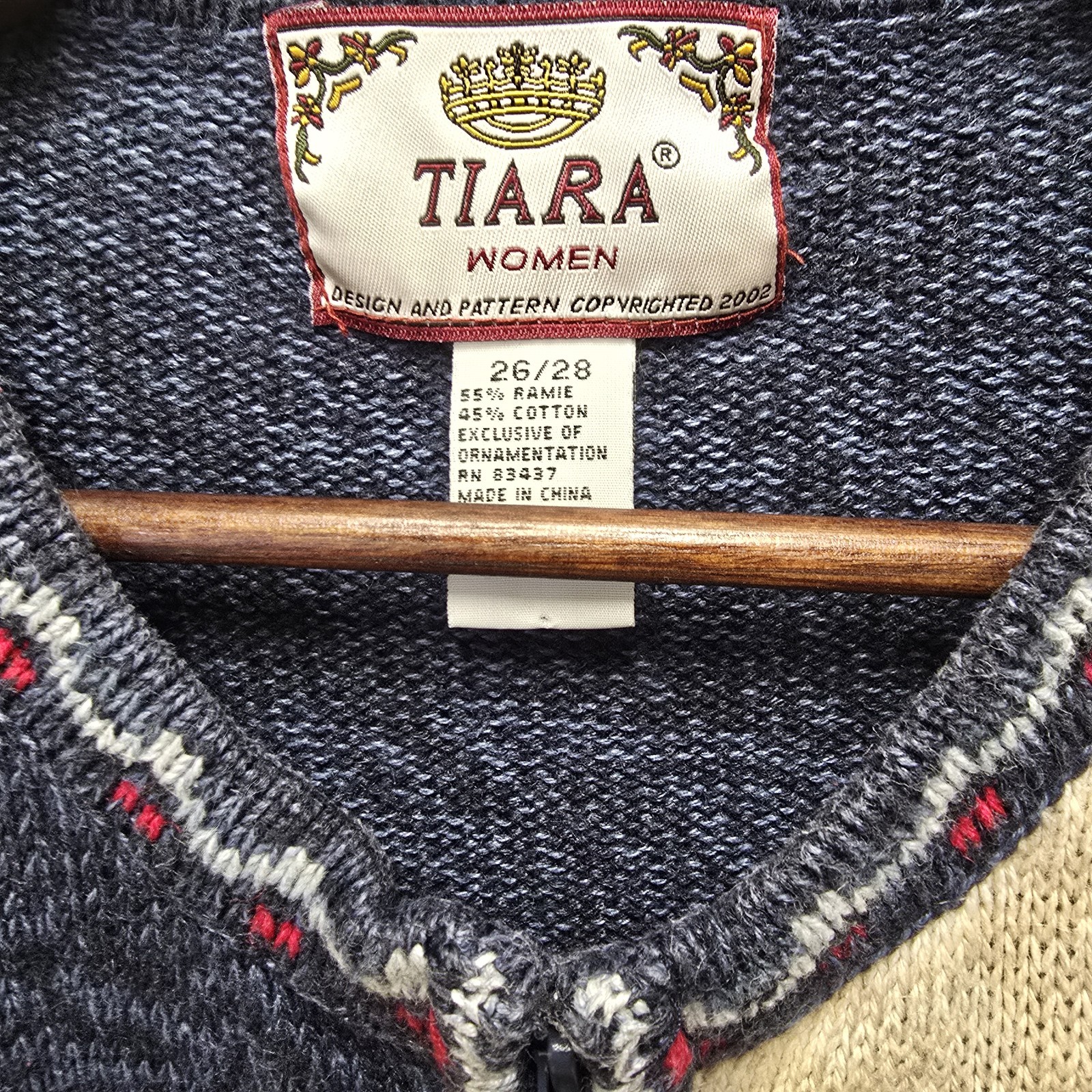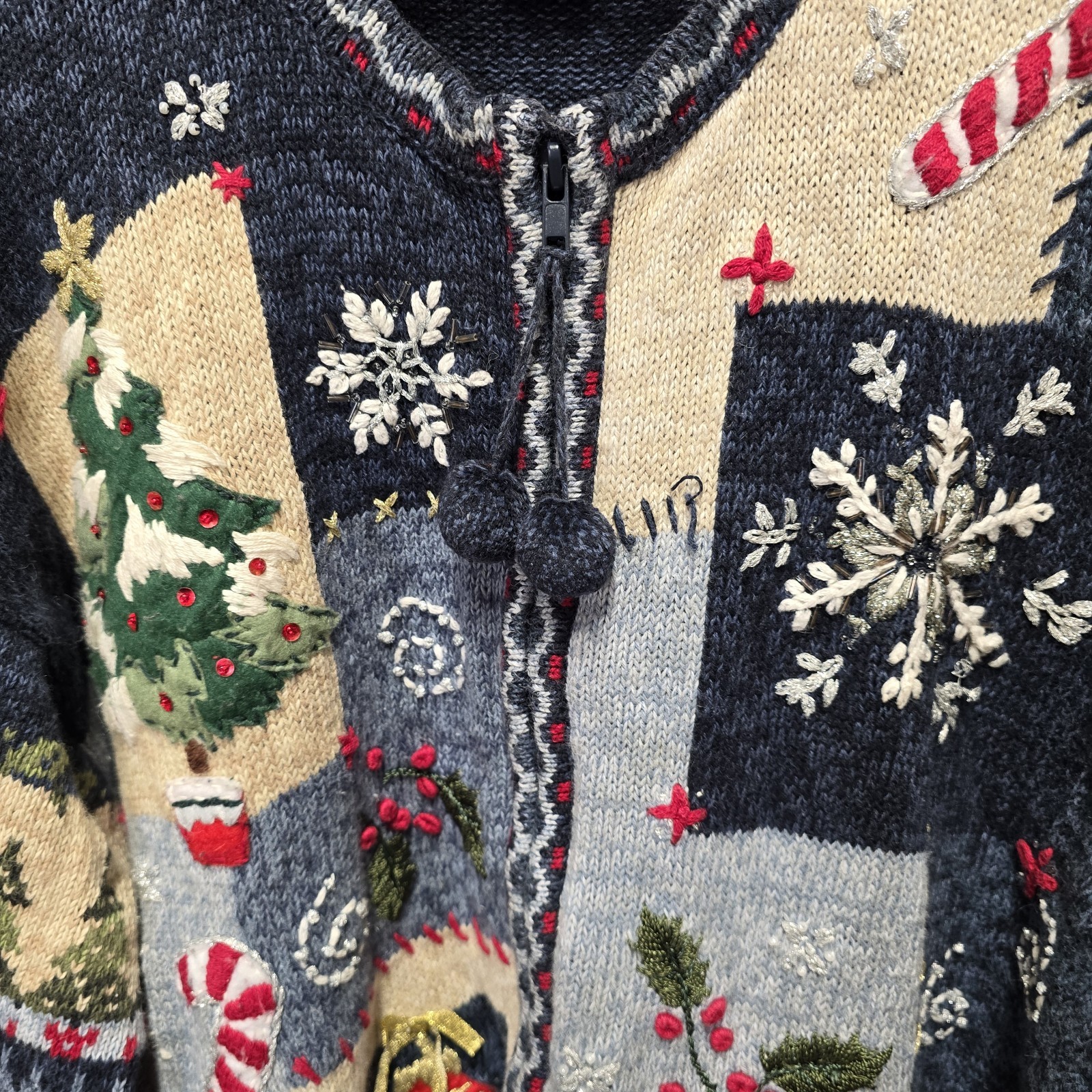 The VTG Tiara International Women's Christmas Ugly Sweater Cardigan is a vintage piece perfect for the holiday season. This blue cardigan features a Fair Isle pattern with snowflakes, a round neckline, and long sleeves. Made of a ramie and cotton blend knit fabric, it is accented with beads, zipper closures, and embroidered details. The 2XL size and regular fit make it comfortable and stylish for women looking to add a touch of Christmas cheer to their outfit. pit to pit 25" length 27" sleeve hem to hem 20.5"