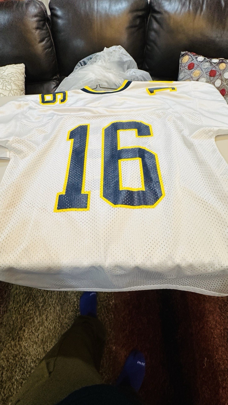 This product is a vintage University of Michigan Wolverines Nike Team Football Jersey in size L, featuring the number 16. It is officially licensed and made for men, showcasing the team's colors of white. The jersey is perfect for representing the Michigan Wolverines during the regular football season. Made in El Salvador, this jersey is a must-have for fans of the team looking to show their support in style.