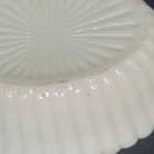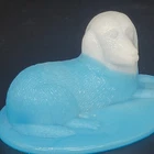 Vintage Westmoreland milk glass covered dish showcases a nicely-marked dog motif. The charming oval-shaped piece, measuring 5.25 inches in length and 4-1/8 inches in height, features a slag glass design in a serene shade of blue, complemented by a vertical rib base that adds a touch of elegance. The lid is inscribed with the number "4" and the dish with the number "5". This decorative candy dish or trinket box originated in the United States, and is a testament to the timeless craftsmanship of the Westmoreland brand.