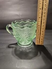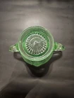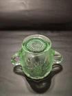 No chips or cracks great condition The product is a vintage Westmoreland green depression sugar dish featuring a beautiful design of grapes and leaves. This collectible piece is made of high-quality glass and is perfect for serving sugar or as a decorative accent in any kitchen or dining room. The unique color and intricate detailing make it a standout piece for those who appreciate vintage and retro pottery and glass items.