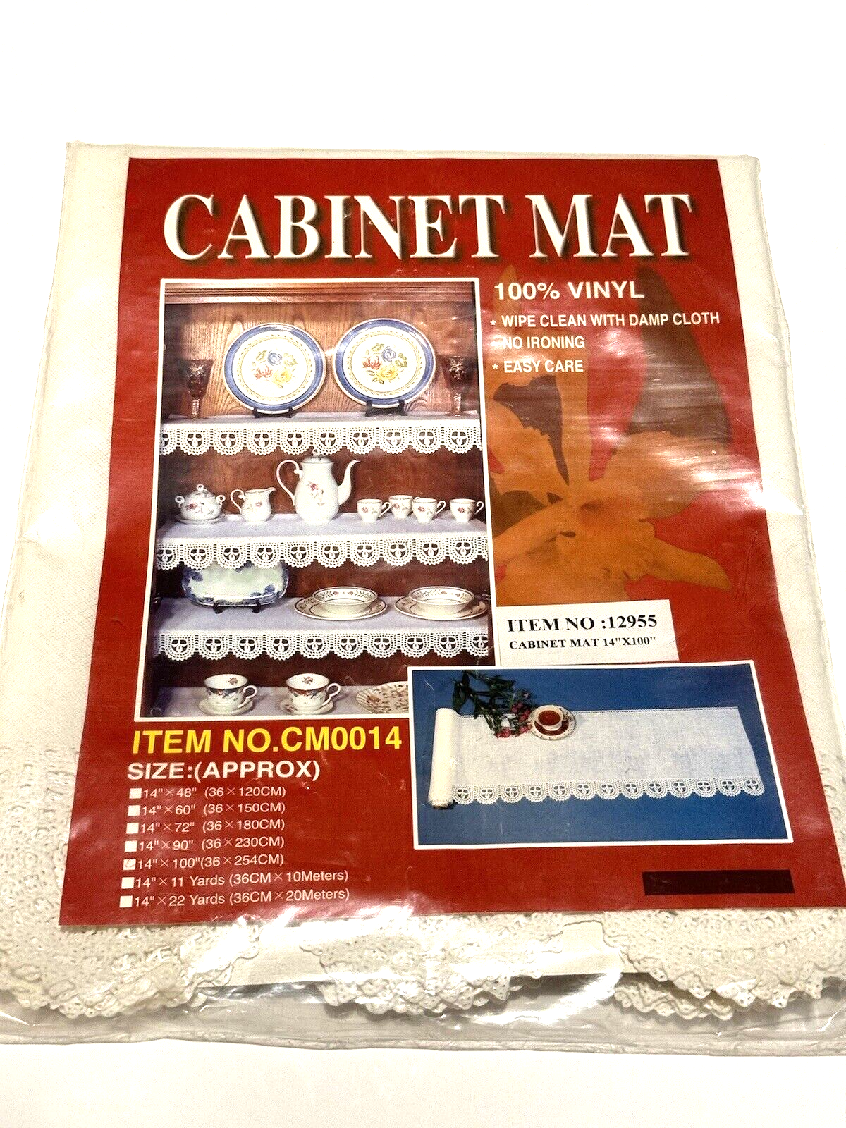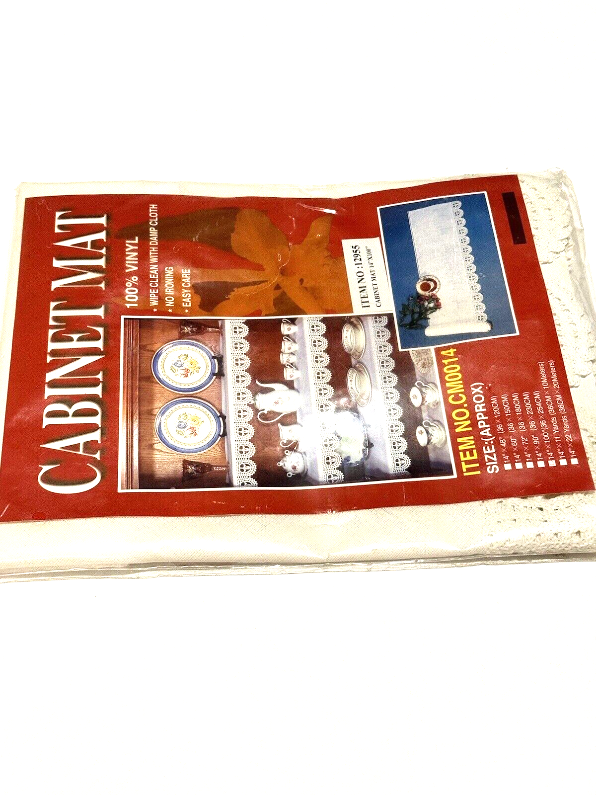 VTG China Cabinet Shelf Liner Hutch Vinyl White Mat 12955 Lace Pattern NEW READ Vintage China Cabinet Shelf Liner Hutch Shelf Liner Vinyl White #12955 Lace Pattern 14" X 100" Wipe Clean with Damp Cloth / No Ironing / Easy Care Made in Indonsia BRAND NEW. There is a tear in the plastic seal (see photos). Smoke free and pet free home. Please see pictures to assess condition and use the enlargement (zoom) feature for added detail. Thank you for your interest. Enjoy!