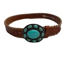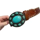 Very Good Pre-Owned Condition (see pics for details). Stunning leather belt featuring an eye-catching oval buckle adorned with faux turquoise stones in a flower-like pattern. The rich brown leather strap showcases beautiful tooled detailing and whipstitched edges. Perfect for festival outfits, western wear, or adding a bohemian touch to everyday looks. Keywords: turquoise belt, western belt, leather belt, boho belt, cowgirl belt, tooled leather, stone buckle, southwestern style, bohemian accessories, western fashion, turquoise buckle, whipstitched belt Size 34 Approximately 38.5" long (without buckle) Please compare measurements to something you already own to verify size and fit We are happy to answer any questions! We ship the next business day!