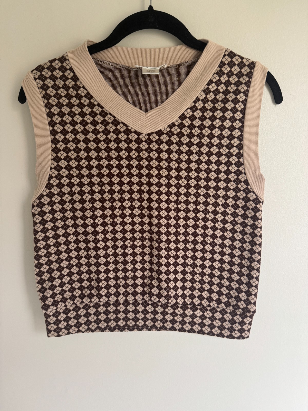 Add the perfect Y2K-inspired layer to your wardrobe with this Vintage Argyle Sweater Vest in a flattering women’s size Medium . Featuring a classic brown and beige argyle pattern , this retro knit piece captures the iconic preppy, academia, and Y2K aesthetics that are trending again. ✨ Item Details Style: Y2K / Retro / Preppy / Academic Aesthetic Pattern: Brown + Beige Argyle Size: Women’s M Material: Knit (soft + comfortable) Neckline: Ribbed V-neck Fit: Classic, slightly cropped vintage fit Era: Y2K / early 2000s style ✨ Condition Pre-owned in very good condition with no holes, stains, or major wear. ✨ Why You’ll Love It Perfect for layering over turtlenecks, tees, or blouses On-trend for preppy, vintage, light academia, and Y2K fashion Great for casual outfits, school looks, or fall layering Soft and comfortable knit—warm without being bulky 📏 Chest (pit to pit): 16 inches Length: 19 inches