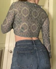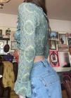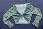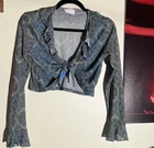 VTG Y2K Does 70s Groovy Paisley Tie Top Festival Crop Top Fairy Grunge Hippie !!! Obsessed. Tie front long sleeve crop top from brand IN CHARGE with ruffle sleeves/collar & a semi-sheer back. Front bust section is lined for modesty. Allover green-ish paisley print. This 90s/y2k era vintage top is a groovy callback to 1970s flower child Woodstock festival vibes !! It's giving sexy disco hippie. It's giving earthy whimsigoth raver. It's giving paisley fairy grunge. You know the vibes Color in first 3 photos is the most accurate Tagged as a size large MEASUREMENTS LAID FLAT PIT TO PIT - 20.5'' SHOULDER TO SHOULDER - 17'' SLEEVE LENGTH - 22'' SHOULDER TO HEM - 15'' (untied) PIT TO HEM - 8.5''