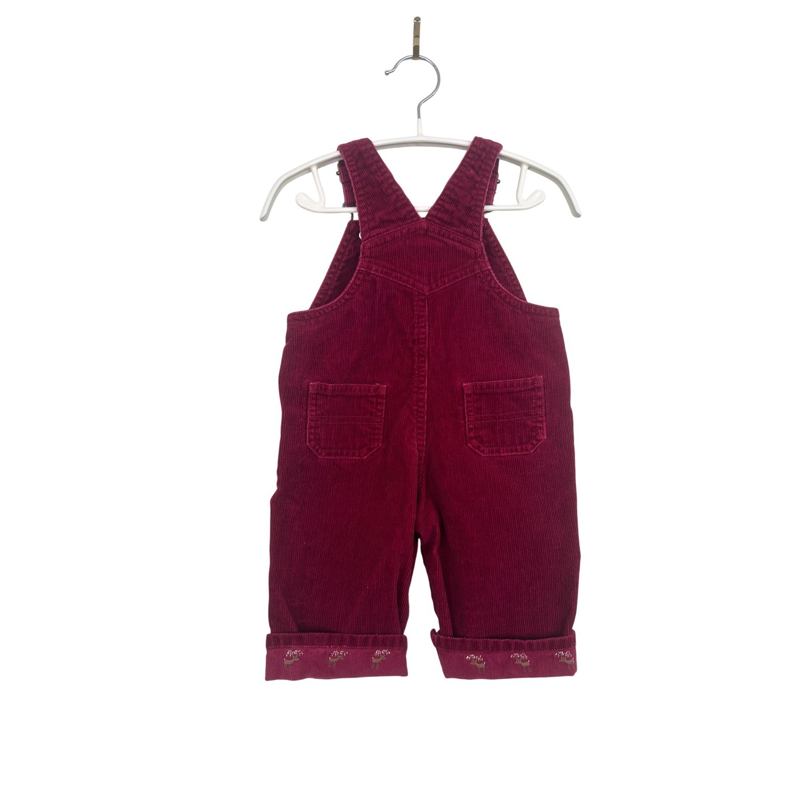 Burgundy red corduroy overalls for baby from Gymboree. These adorable overalls feature adjustable straps, a bib pocket with snap closure, and side snaps for easy dressing. The cuffs are rolled and adorned with a charming embroidered reindeer pattern, adding a festive touch. Perfect for holiday gatherings or everyday wear during the cooler months. Measurements: • Waist: 10 in • Inseam: 7 in • Length (strap to cuff): 22 in Department: Unisex Baby & Toddler Season: Fall, Winter Theme: Deer Style: Overall Set Includes: Pants Number of Pieces: 1 Piece Fabric Type: Corduroy Pattern: Solid Material: Cotton Occasion: Casual Features: Adjustable Strap, Pockets Accents: Embroidered, Button Sleeve Length: Sleeveless Type: Outfit/Set Keywords: baby overalls, corduroy pants, holiday baby, winter baby, Christmas outfit, festive baby, embroidered, snap closure, rolled cuff, baby fashion, fall baby, baby apparel All items come from a smoke free, golden retriever dog friendly home. All of items unless NWT or Dry Clean Only are washed with Tide. We try our best to disclose any flaws with items, if we miss something please reach out and let us know.