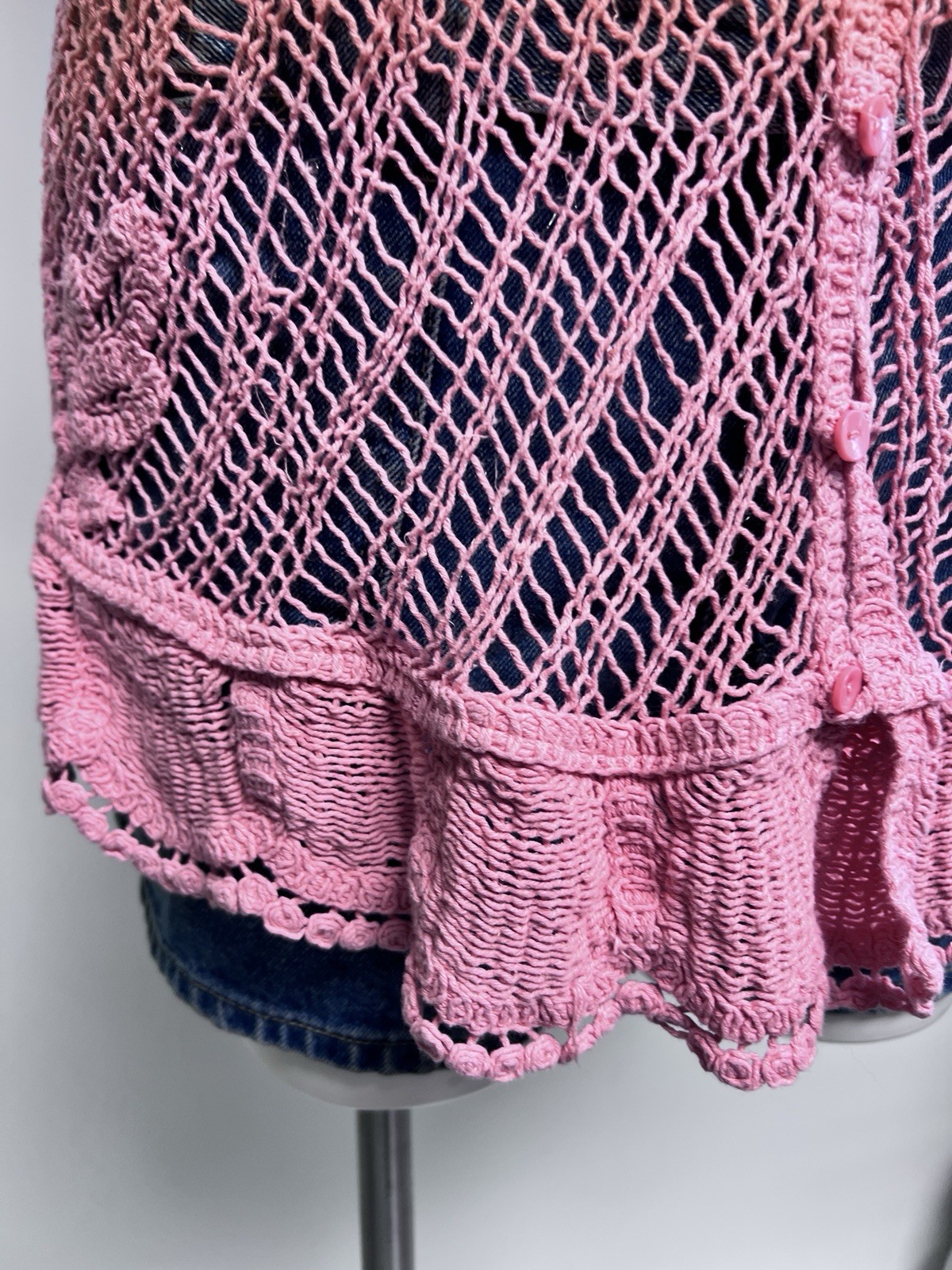 VTG Y2K Pink Vest Crochet Cardigan Open Knit Sweater 22/24W Hippie Boho Festival Pit to pit- 26” Length- 30”