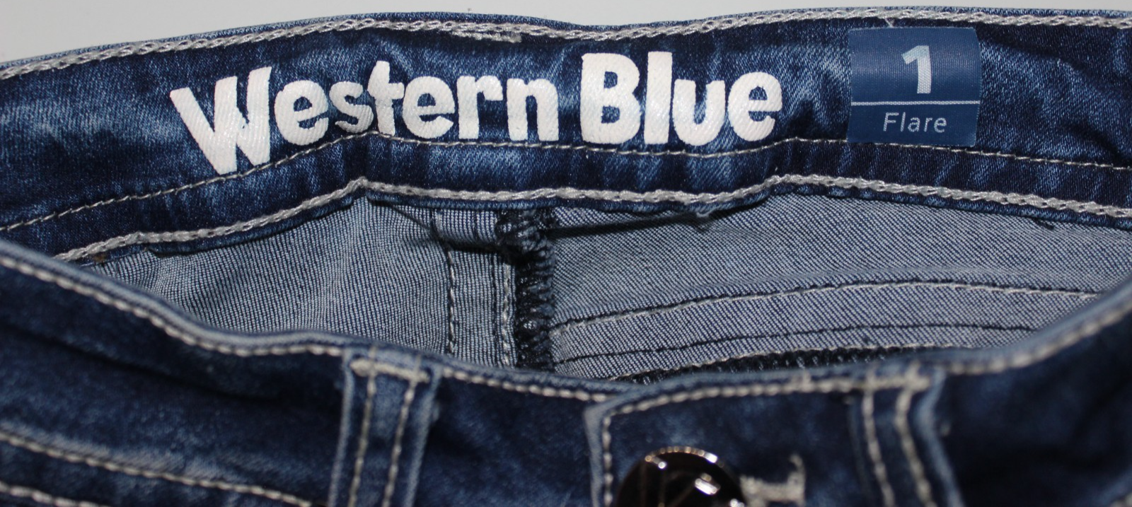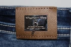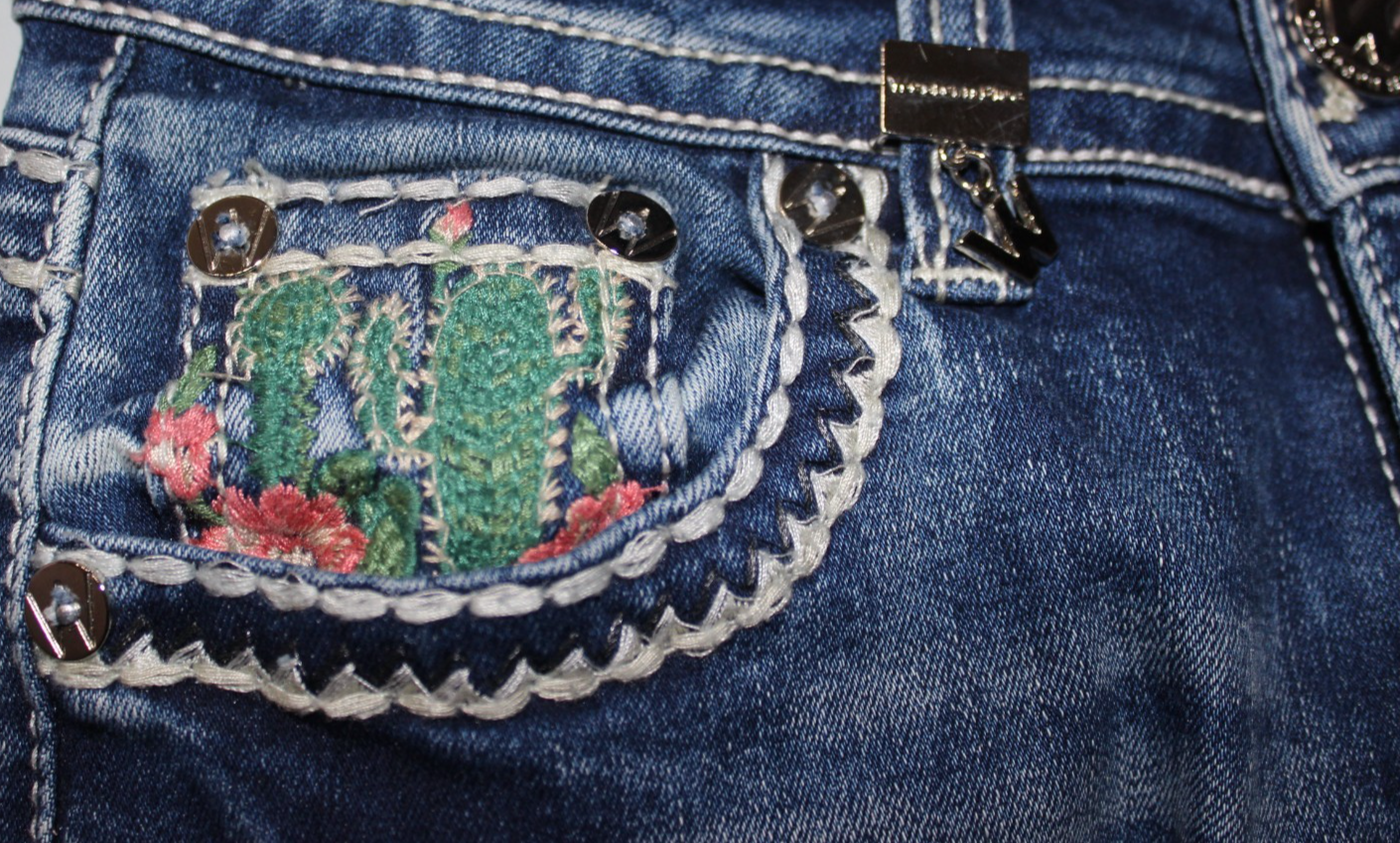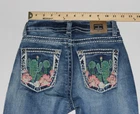 These vintage Western Blue Jeans in women's size 1 feature a flare fit with a faded blue color and embroidered pockets, adding a unique touch to your wardrobe. Made from a cotton blend denim fabric, these slim-fit jeans are machine washable and have a 5-pocket design for added style and functionality. With a timeless solid pattern and accents like buttons and zippers, these jeans are perfect for all seasons and subtly showcase a Southwestern theme. Pair these stylish jeans with your favorite top for a classic yet trendy look.