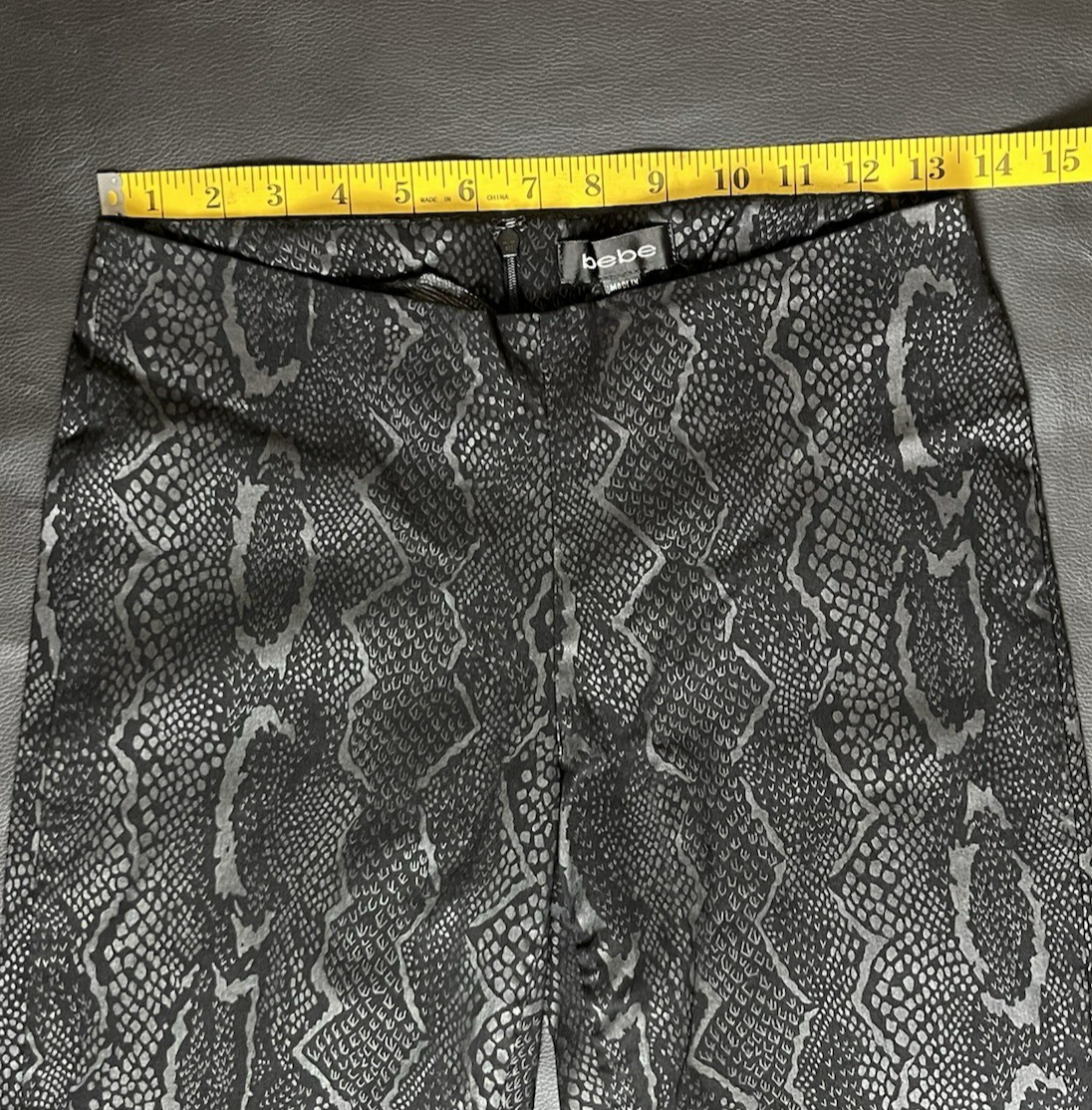 Please refer to the photos for measurements. Offers are welcome, and we are happy to provide additional pictures or measurements upon request. Thank you! Condition: Great preowned condition. This vintage item shows gentle wear consistent with its age. Please note the last 2 photos display minor loose stitching near the center seam (crotch/bottom area). This is not a full hole and appears to be a very simple fix. Please review all photos carefully as they are an essential part of the condition description. Description: Stunning Vintage Y2K bebe Pants in a sleek Black and Silver/Gray metallic snake print. This piece is a classic representation of the early 2000s club-to-street style that bebe was famous for. The pants feature a flattering fit-and-flare silhouette with a dramatic front slit hem on each leg, adding movement and an edgy touch. They are made from a comfortable, quality stretch blend that provides a smooth fit and easy movement. Details include a hidden back zipper closure for a streamlined look and a low/mid-rise waist, typical of the era. The metallic snake print is eye-catching and perfect for a Vampy, Y2K, or Glam aesthetic. Measurements (Approximate - taken with garment laid flat): * Waist: ~13.5 inches across * Inseam: ~32.5 inches * Slit Length: ~9.5 inches Circa: Y2K (Late 1990s to Early 2000s)