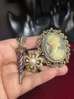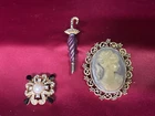 This lot includes three beautiful vintage brooches from the brand Cameo, each featuring a unique design. The brooches are perfect for adding a touch of vintage charm to any outfit. The first brooch features a lovely umbrella design, while the second and third brooches showcase intricate floral designs. Each brooch is made with high-quality materials and is in excellent condition, ready to be added to your jewelry collection. These brooches are perfect for any occasion and will make a great addition to any outfit.