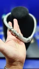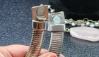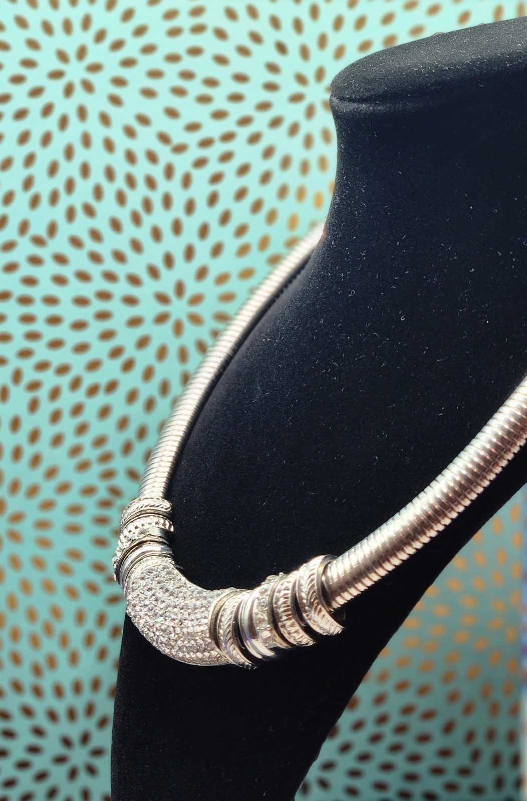 The VTG snake omega choker necklace features a silver tone metal chain with clear rhinestones set in a pendant bar. The magnetic closure ensures a secure fit, and the vintage design adds a touch of retro flair to any outfit. This choker necklace, measuring 16 inches in length, is a fashionable piece perfect for women who love bold statement accessories with a 1980s style.