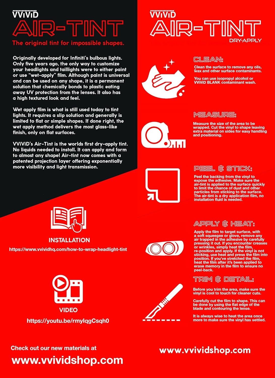 VViViD Air-Tint Extra-Wide Headlight Taillight 16 x 48 + toolkit, Smoke Black Product Details Brand: VViViD Color: Smoke Black Recommended Uses For Product: Car Theme: Automobile Cartoon Character: Bubble Special Feature: Scratch Resistant Number of Pieces: 1 Style: Custom Embellishment: Crystal Reusability: Single Use Item Form: Sheet Pattern: Solid Shape: Rectangular Indoor/Outdoor Usage: Outdoor Finish Type: Powder coated Number of Items: 1 Size: 16" x 48" + toolkit Package Dimensions: 15.86 x 2.17 x 2.01 inches Item Weight: 8.8 ounces Manufacturer: VViViD Is Discontinued By Manufacturer: No Surface RecommendationMaterial: Plastic, GlassVinyl VVIVID Air-Tints are an industry first: a headlight/taillight tint with all of the technologies developed in VVIVID+ premium materials. They include an air-release membrane which allows you to install the tint dry ( without installation liquid ) Ready to use out of the box! This is the only film on the market that can wrap ANY SHAPE. It is super conformable with heat. It was originally manufactured for hard-to-wrap surfaces, but the ease of install has professionals saving time on any headlight shape. This film is also self healing and scratches will go away with heat! Simply cut the vinyl to shape, and apply it to the surface. To make the vinyl conform to curves, simply heat with a heat gun or hair dryer, stretch and apply. Lastly, using a sharp blade, trim away excess from the headlight and you're done! its literally that simple! Made with scratch-resistant automotive grade cast vinyl, VVIVID Air-Tints were developed in Canada to reduce the risk of shrinkage and peeling almost completely! The adhesive is acrylic based which will not eat through plastic like other tints on the market. It is 100% chemical safe, and will not eat through headlight coatings or damage your lights. Includes vinyl wrap tools: Yellow Detailer Squeegee and 2x Anti-scratch Black Felt Edge Decal