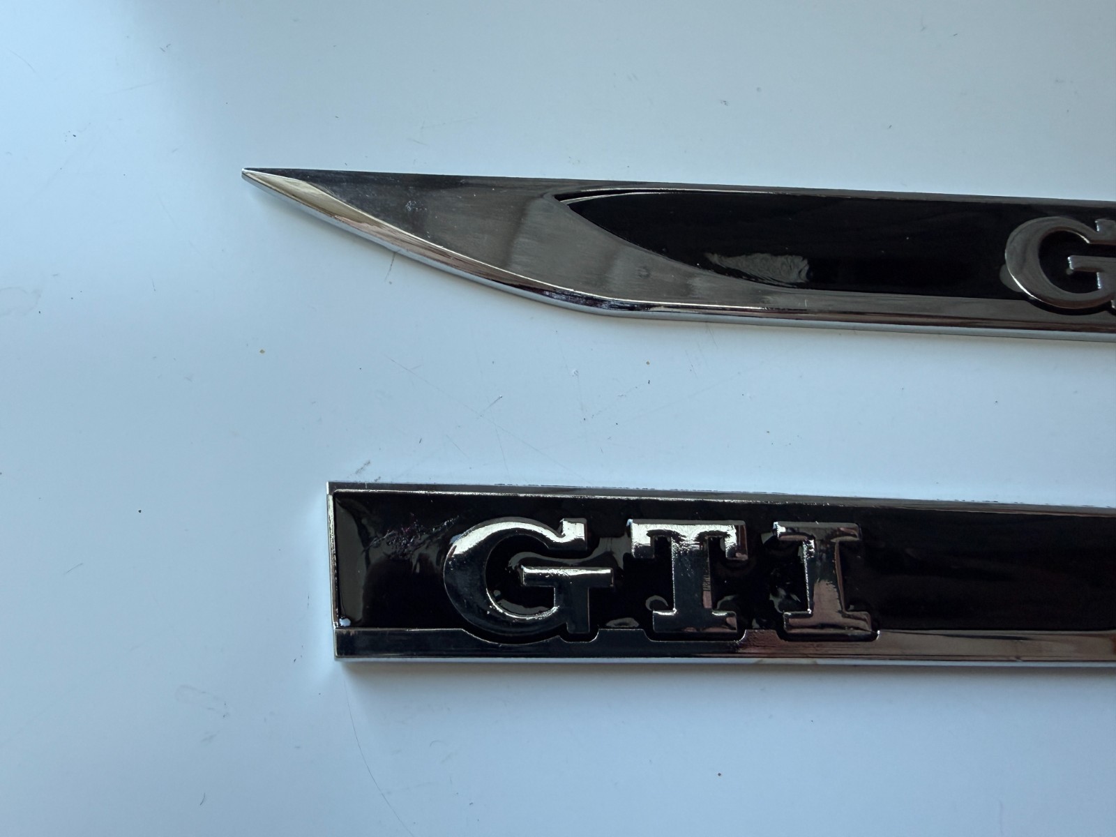 VW GOLF MK7 GTI 2013–2020 BLACK CHROME WING BADGES – FRONT FENDER EMBLEMS – REPLACEMENT SET Upgrade the styling of your vehicle with these premium replacement black chrome wing badges , designed specifically for the VW Golf Mk7 GTI. Perfect for enhancing the sporty look of your car or replacing worn or faded original emblems. 🔧 Key Features Designed for VW Golf Mk7 GTI Models (2013–2020) Finish: Black Chrome (Gloss Finish) Position: Front wings / fenders (left & right) Condition: Brand New High-quality replacement parts Easy installation – adhesive backing 🚗 Compatibility Fits: VW Golf Mk7 GTI (2013–2020) ⚠️ Important: These are replacement aftermarket badges , not genuine OEM parts. Please check shape and size against your existing badges or message us with your vehicle details to confirm fitment.