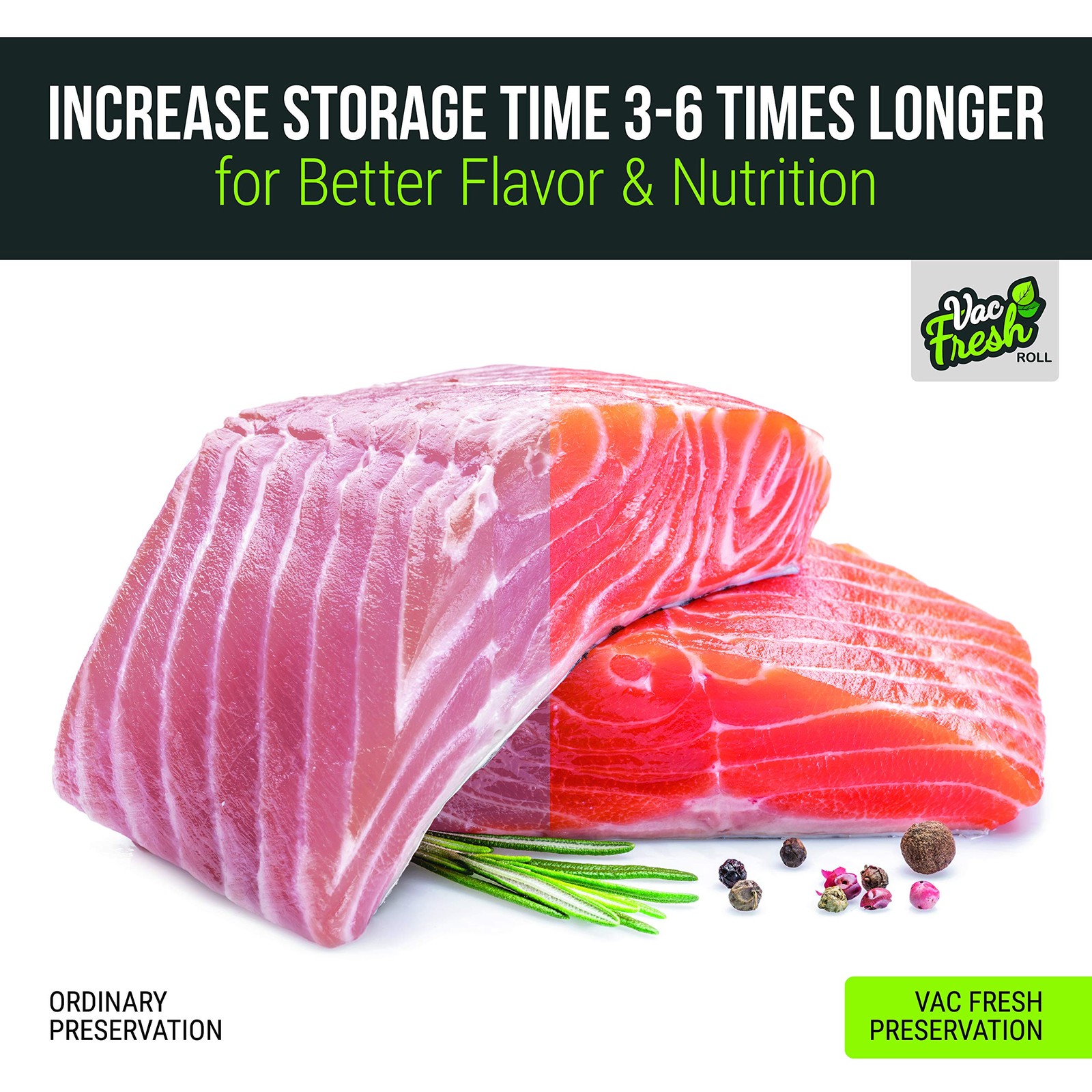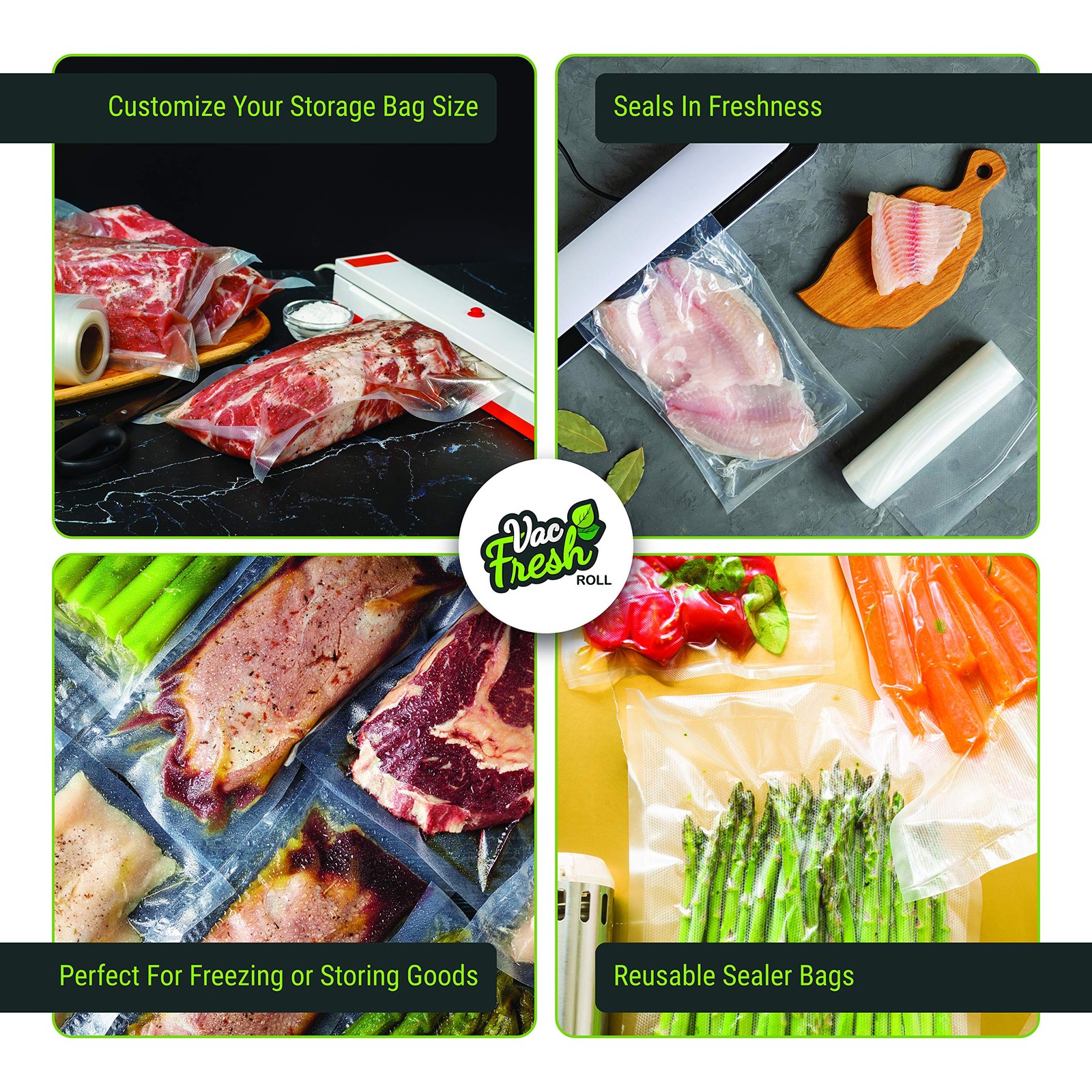commercial grade heavy duty 3.5mil vacuum seal bags on a roll. Our embossed vacuum sealer bags are universal and can be used with all types of vacuum sealer machines. Designed for fast air escaping speed and maximum air extraction with your food sealer. Safely store your food for months at a time without damage from moisture or air with vacuum sealer bag rolls. KEEP YOUR FOOD FRESH 5X LONGER - Vac-Fresh vacuum sealer bags provide the perfect solution for storing and preparing food. Whether it's long-term storage or leftovers, these bags will help your food maintain flavor, freshness, and nutrients. Storing food in these vacuum-sealed bags helps to remove the air which keeps food fresh and safe to eat for far longer than standard plastic bags or containers. The shelf life is extended up to 3-5 times. Frozen food that is sealed can last up to 2-3 years. USE WITH ANY VACUUM SEALER - This pack comes with 12 rolls, each with 50 feet worth of bags. The width of the bag is 8 inches which is perfect for larger food items or entire meals. Vac-Fresh bags are made with a 7-layer construction to keep more air out when sealed. These universal vacuum bags can be used in most leading brand vacuum sealers including FoodSaver, Weston, Geryon, NutriChef, Vesta Precision, and more. BULK FOOD STORAGE - Experience year-round freshness by using vacuum sealing to store seasonal or perishable items such as fresh vegetables, fruits, and herbs. Save money by purchasing food such as beef or chicken in bulk or family value packs. These bags also provide a fast and easy way to organize your meal prepping during the week. Meals take up less space in the freezer, refrigerator, or cabinet. Lunches will never be the same after experiencing the delectable freshness of vacuum-sealed food. GREAT FOR COOKING - People who are on the go with active lifestyles love our vacuum sealer rolls because they are quick and easy to use. Chefs also prefer Vac-Fresh for Sous Vide cooking. The bags provide an efficient way to prepare the meal while also improving the taste. Vacuum sealer bags are the best method for marinating meat for ultimate flavor. Many even use vacuum sealing bags to prevent jewelry or silver from tarnishing.