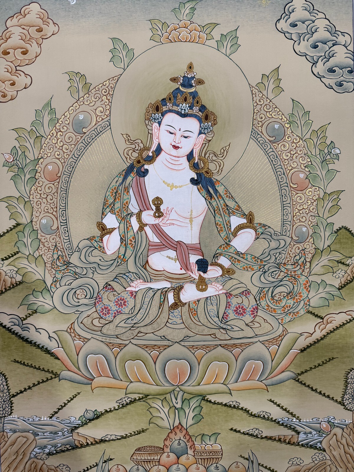 Namaste and Welcome to my Gallery!!! All of the paintings and arts in my gallery are originally handmade and hand-painted by my family members and other local artists who have been practicing their craft for over two decades. My father is Master Artists Nepal with an experience of more than four decades; you can see some of his work in this Gallery. Also you can see some of the beautiful and soulful artwork of talented local artists from Himalayas. ~~Vajrasattva Thangka~~ Vajarasattva symbolizes the purification of deluded perceptions that obscure enlightened mind. Vajarasattva holds in front of his heart a vajra, representing the minds enlightened essence and against his thigh, a bell representing insight into the empty nature of reality. [Size = 58cm x 44cm] Material Used: • Cotton Canvas • Natural Pigments and colors • Gold leaf ~Excellent for meditation or home/office decor, ~Tibetan Yoga Wall Art ~Genuine 100% hand-painted from Himalayas Please feel free to contact me if you have any question regarding the painting.