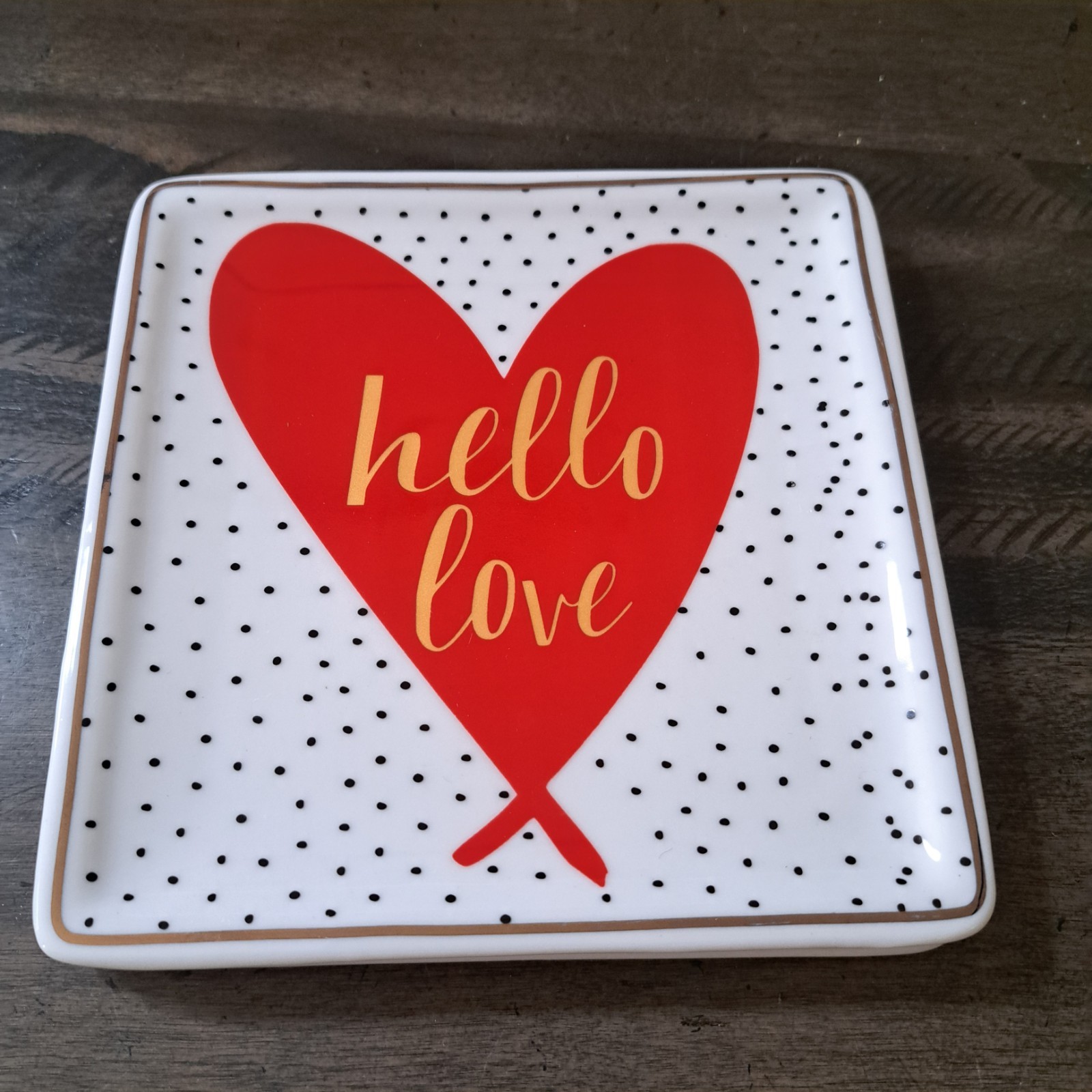 The Valentine Snack Plates Set of 2 features a romantic design with a red heart and the phrase "Hello Love", making it perfect for a Valentine's Day celebration. Made of porcelain, these 5.75"x5.75" plates are easy to care for and clean with a damp cloth amd warm water. The red and white color scheme adds a festive touch to any table setting, making them a charming addition to your holiday decor.