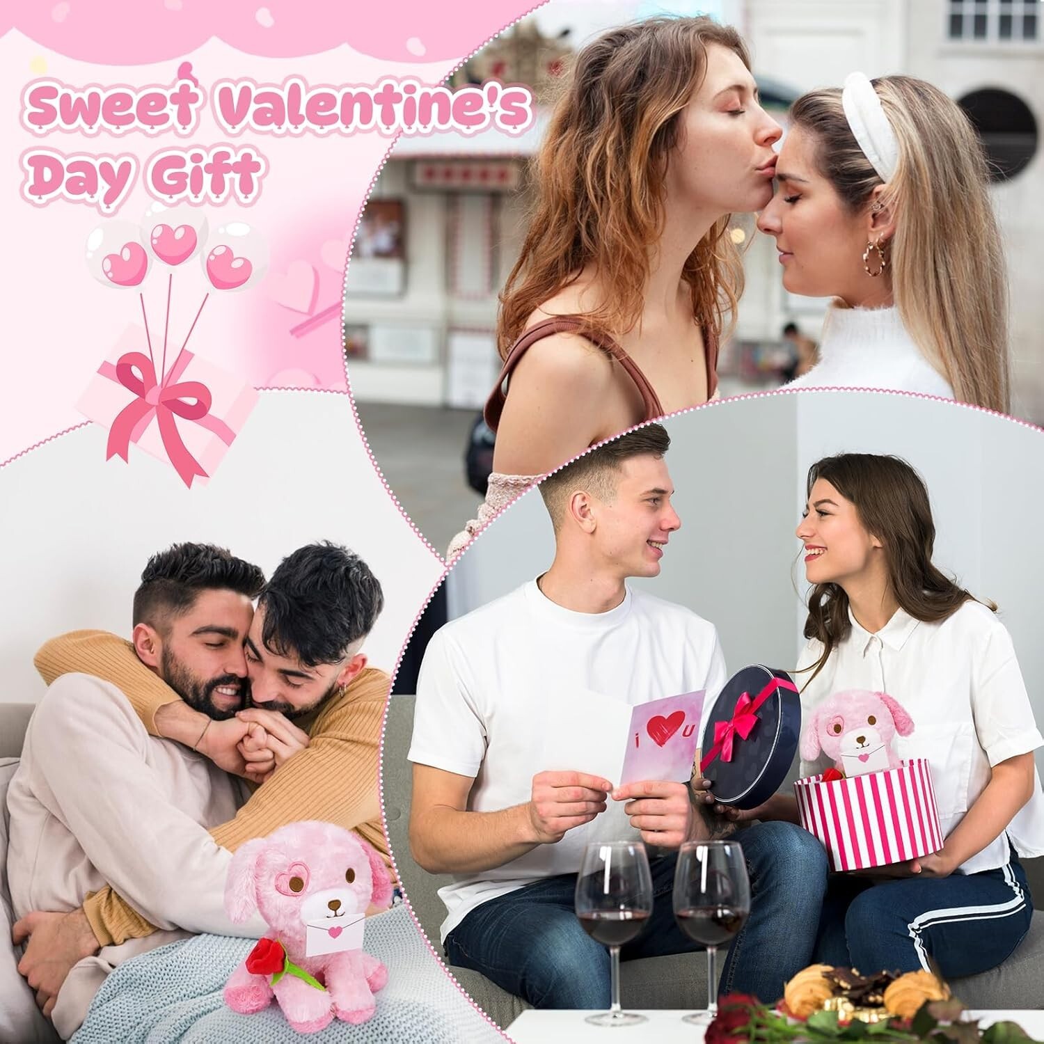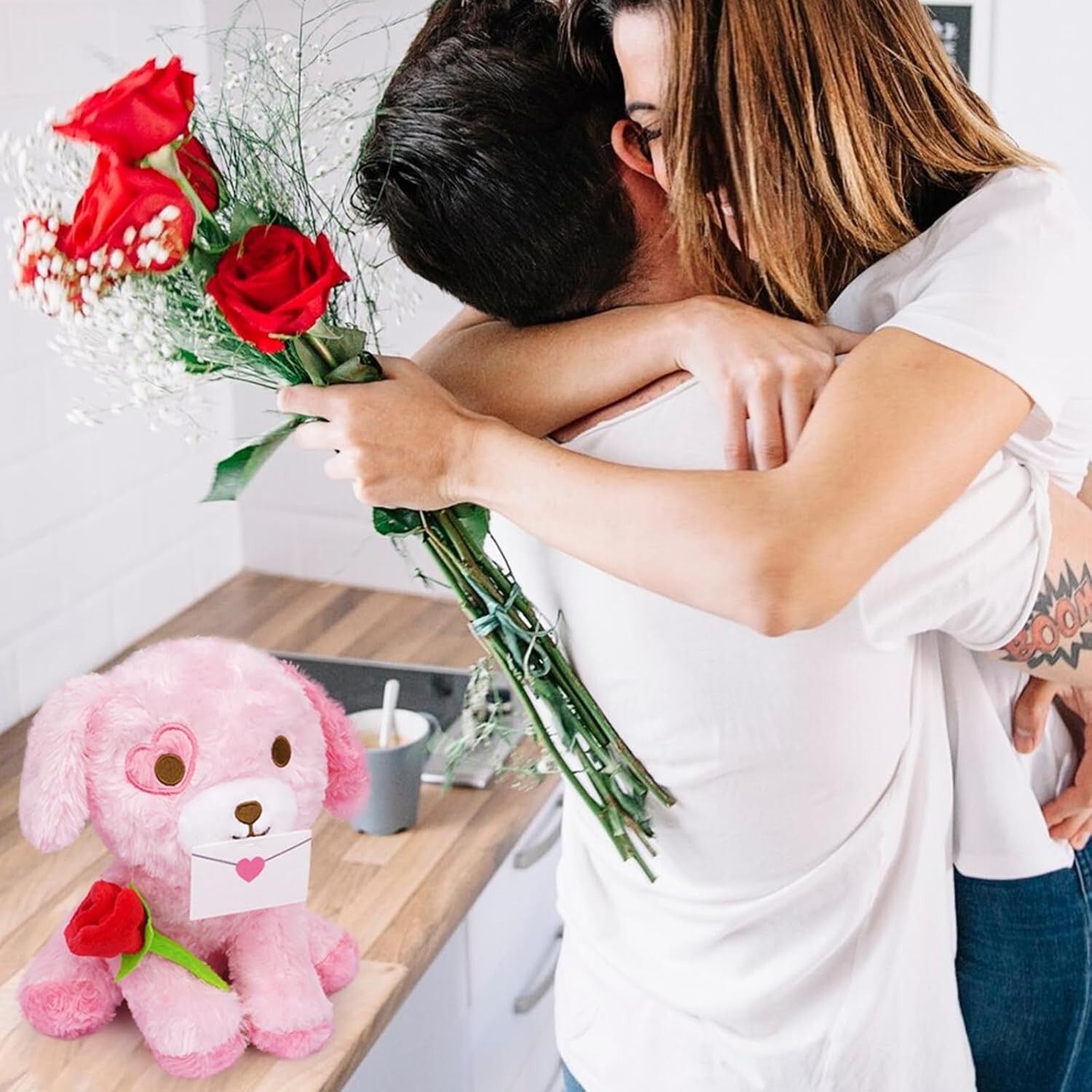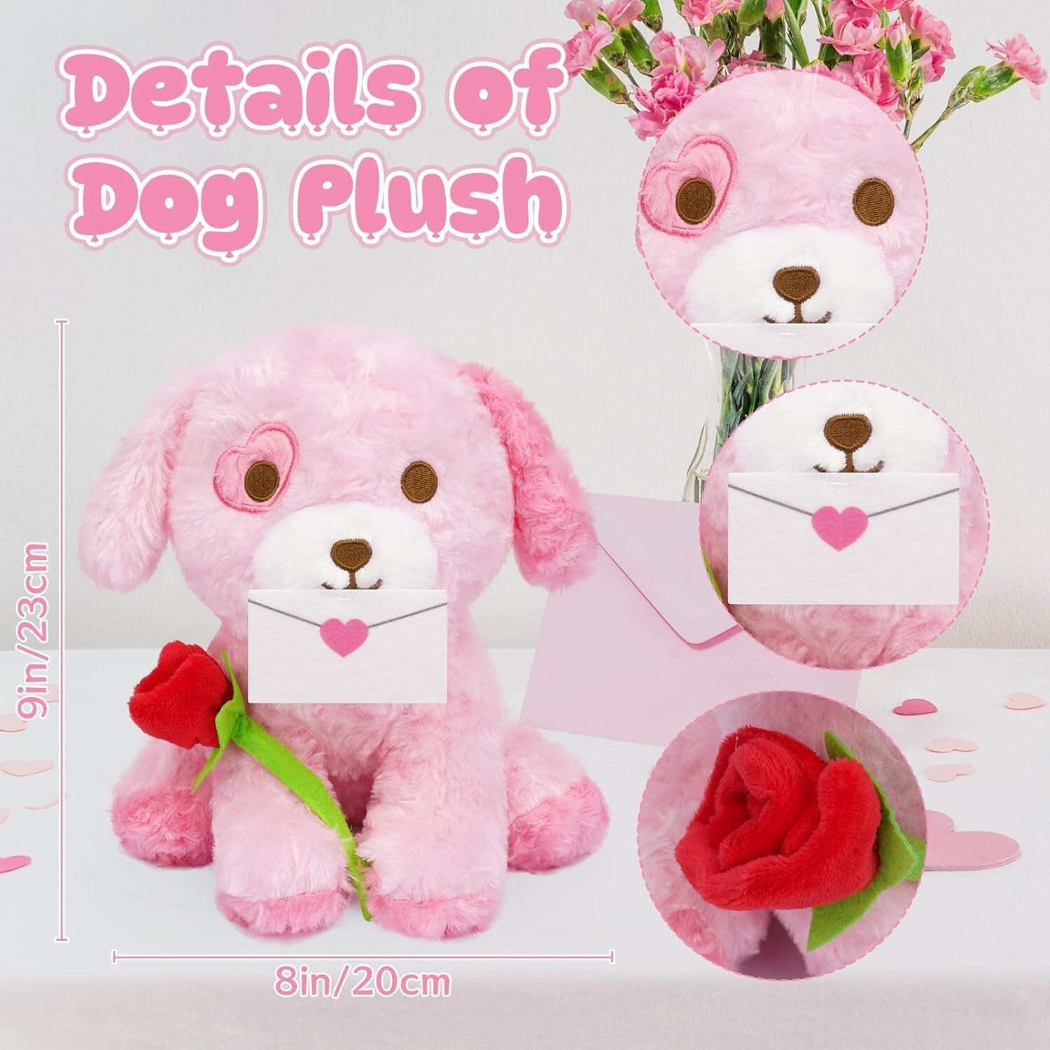 Valentine's Day Puppy:Super cute Valentine's Day plush dog mouth holding an envelope and roses in his arms to surprise you on Valentine's Day,making your life full of sweetness and happiness!No one can resist an adorable pink dog stuffed animals Cute Design:The adorable dog stuffed animal has different colored ears with a love eye,and the all day design is perfect for Valentine's Day.Valentine's Day Dog plush pillow has slightly curled hair and vivid expressions,making the puppy plushie perfect as a gift for the person you love Sweet Gift:Pink Valentine's Day dog plush has various elements representing happiness and sweetness,such as love, rose,and envelope.The cute dog plushie is one of the best gifts for lovers and children on Valentine's Day, birthdays,Christmas Soft Dog Plush:The Valentine's Day plush dog is made of high quality short plush and soft pp cotton,skin-friendly and comfortable to touch,a warm friend and pet for all age people.A sweet Valentine's Day home decorations After-sales:Valentine's Day puppy plush is vacuum packed, please don't mind if it's flat! After tearing open the packaging and tapping the dog's plush body,it will regain its fluffiness within 1-2 days.If there are any quality issues with the dog doll,we will provide reasonable solutions