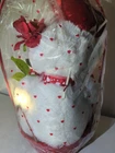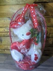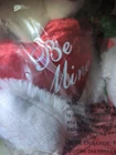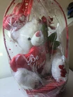 This is a Valentine's Day stuffed plush toy featuring a big white bear with a love heart in a gift basket, holding a rose. It is medium-sized. The bear is a lovely gift idea for the occasion.