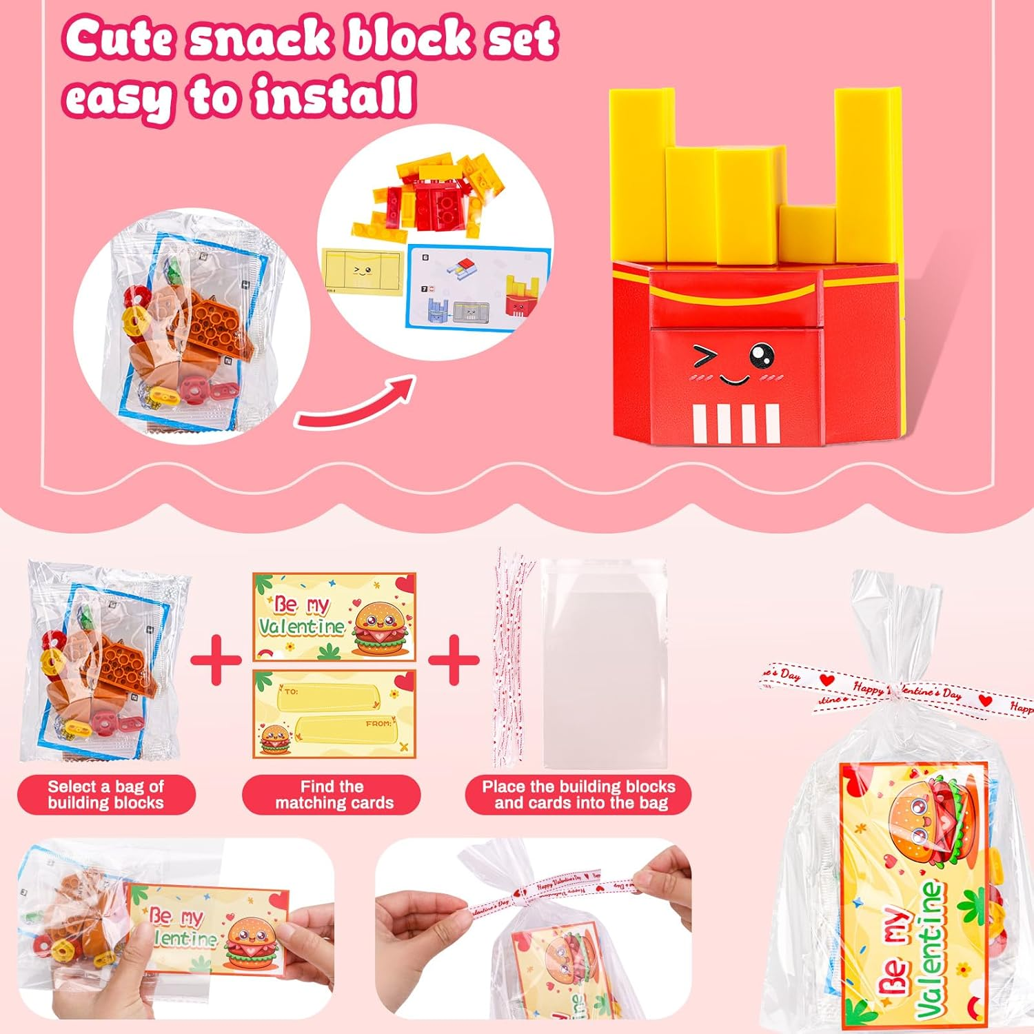 Valentine's Day Party Favors Set: Includes 30 adorable building blocks shaped like hamburgers, chocolates, French fries, hot dogs, steamed eggs, ice cream, peaches, pineapples, watermelons, and apples, perfect for kids' Valentine's Day themed parties. Accompanied by Valentine's Cards and Transparent Bags: Valentine's building blocks set comes with 30 Valentine's cards and 30 transparent bags, allowing your little ones to easily share these fun blocks and cards as gifts. Fun Classroom Activities for Valentine's Day: Kids can unleash their creativity by assembling the blocks, enjoying hands-on fun while developing teamwork and communication skills. Suitable for Multiple Occasions: Ideal for use in classrooms, Valentine's Day parties, birthday celebrations, and holiday events, making it the perfect small gift for classmates and friends. Safe Materials for Family Fun: All Valentine's blocks are made from safe and eco-friendly materials, ensuring children's health and safety, and are suitable for interactive games that parents can enjoy with their kids. Product Description MGparty 30PCS Valentines Day Gifts for Kids Classroom-Valentines Building Blocks Valentines Day Gifts,Valentines For Kids Classroom Valentines Cards For Kids Classroom,Valentine's Day Gift Kids Valentines Day Gifts For School,Valentines For Class Class Valentines Day Gifts For Kids,Valentines Day Gifts For Kids Classroom 30 Pack Valentine's Day Cards Building Block for Kids The video showcases the product in use. The video guides you through product setup. The video compares multiple products. The video shows the product being unpacked.